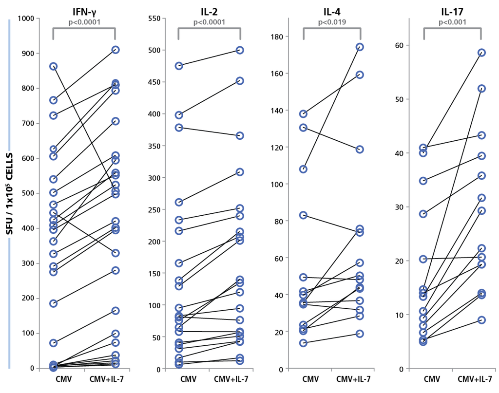We also tested the response of CD8 cells using the same concentration of IL-7 as described above, and stimulating PBMC with a CEF (Cytomegalo-, Epstein Barr-, and Flu- virus) peptide pool, or CEF-7 (a peptide of the HCMV pp65 protein). The number of peptide antigen-induced spot forming units between the PBMC stimulated with and without IL-7 did not exhibit any striking differences and did not show any statistical differences. The data is presented in Figure S1.