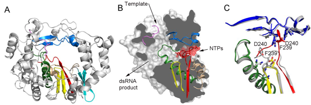 RNA dependent RNA polymerases (RdRPs) are the catalytic components of the RNA replication and transcription machineries and the central players in the life cycle of RNA viruses. RdRPs belong to the superfamily of template-directed nucleic acid polymerases, including DNA-dependent DNA polymerases (DdDP), DNA-dependent RNA polymerases and Reverse Transcriptases (RT). All these enzymes share a cupped right hand structure, including fingers, palms and thumb domains, and catalyze phosphodiester bond formation through a conserved two-metal ion mechanism [1]. A structural feature unique to RdRPs is the “closed-hand” conformation, in opposition to the “open-hand” found in other polynucleotide polymerases. This “close-hand” conformation is accomplished by interconnecting the finger and thumb domains through the N-terminal portion of the protein and several loops protruding from fingers, named the fingertips that completely encircle the active site of the enzyme [2,3]. In the prototypic RdRPs the closed “right hand” architecture encircles seven motifs (A to G) conserved in sequence and structure (Figure 1), playing critical roles in substrate recognition and catalysis. Three well-defined channels have been identified in the RdRP structures, serving as: the entry path for template (template channel) and for nucleoside triphosphates (NTP channel) and the exit path for the dsRNA product (central channel) (Figure 1B).