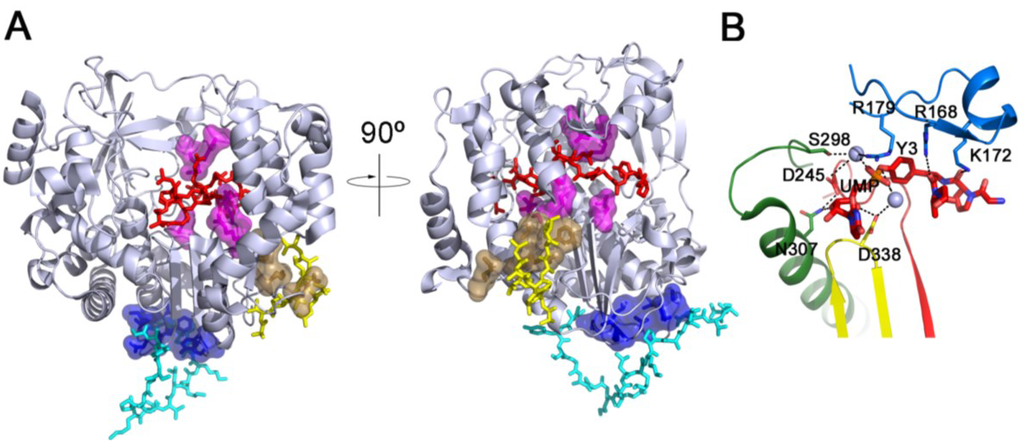 (A) Comparison of identified VPg binding sites in picornavirus 3Dpols. Because all reported structures of picornavirus 3Dpols share high structural similarities, we used the structure of the FMDV 3Dpol (PDB id. 2F8E, [2]) as a representative model in this figure and colored it with a light-blue cartoon. The bound VPgs with FMDV [13], CVB3 (PDB id. 3CDW, [8]) and EV71 (PDB id. IKA4, [34]) are shown as red, yellow and cyan sticks, respectively. The residues for VPg (or 3AB) binding in PV (F377, R379, E382 and V391) [33], FMDV (E166, R179, D338, D387 and R388) [13] and EV71 (T313, F314, I317, L319, D320, Y335 and P337) [34] 3Dpol are represented as a surface and colored as sand, magenta and blue, respectively, in the cartoon representation; (B) Details of the interactions described in the active site of the FMDV 3Dpol during the uridylylation reaction. The VPg residues and UMP covalently linked are shown in red sticks, the divalent cations are shown as light-blue spheres and the amino acids involved in uridylylation reaction are shown as sticks. The motifs A, B, C and F are colored in red, green, yellow and blue, respectively.