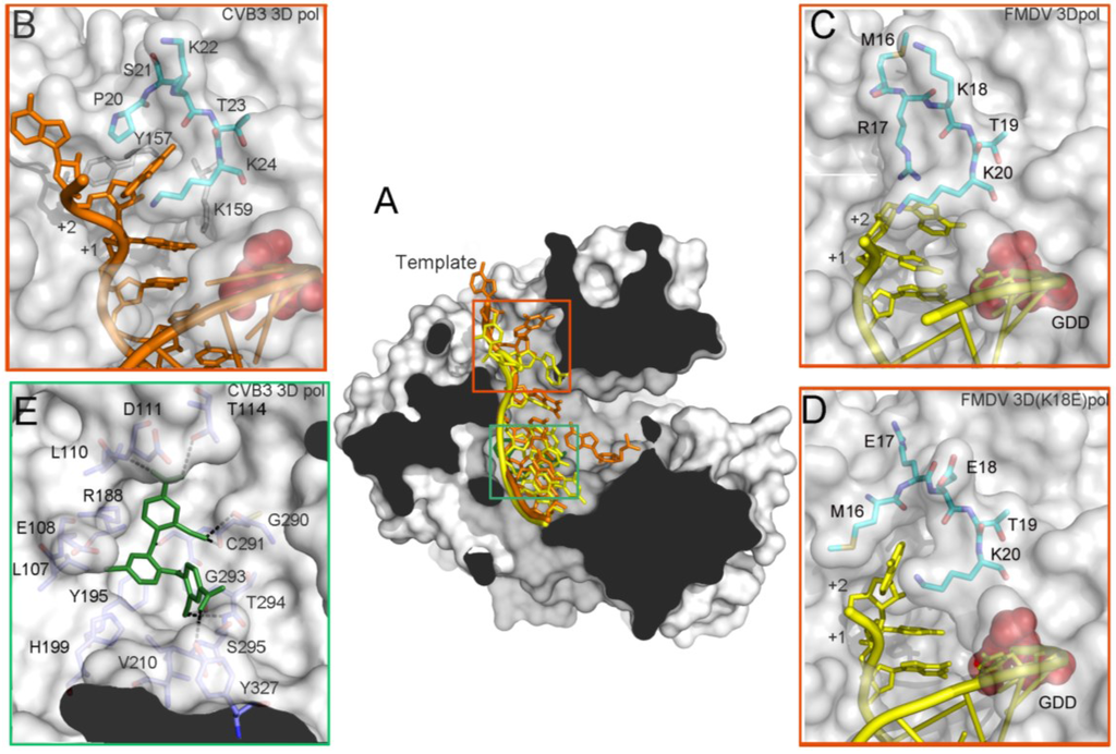 Structure and interactions in the template channel of a picornavirus 3Dpol. (A) The structure of the CVB3 3Dpol (PDB id. 4K4Y) has been used as a model, the molecular surface of the polymerase is shown in grey with the acidic residues of the active site in red and the RNA depicted as a cartoon in orange and the FMDV RNA is superimposed in yellow. The non-nucleoside analogue inhibitor is also superimposed in green; (B) Structure and interactions in the template channel at the entrance of the active site of CVB3 3Dpol (PDB id. 4K4Y), the N-terminal residues 20–24 depicted as sticks in cyan and the RNA in orange and others residues involved in the binding RNA are represented as grey sticks; (C) The wild type FMDV 3Dpol-RNA complex (PDB id. 1WNE); and (D) the FMDV 3Dpol (K18E)-RNA complex (PDB id. 4WZM); (E) Interaction network between GPC-N114 and its binding pocket of CVB3 3Dpol represented by surfaces (PDB id. 4Y2A). The polymerase residues in direct contact with the inhibitor are shown with sticks in atom type color with carbon in slate and explicitly labeled. Hydrogen bonds are depicted as dashed lines.