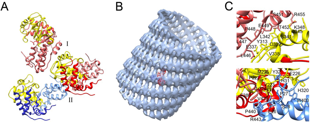 Oligomerization of the PV 3Dpol. (A) Polymerase-polymerase interactions mediated by interfaces I and II, explicitly marked (PDB id. 1RDR) in yellow palm subdomain, in red and blue fingers subdomain and in light colors thumb subdomain; (B) Volume map of the reconstructed 3Dpol tubes with the crystallographic model positioned inside. The volume map was reproduced from [78] (EM code emd2270); (C) Close up of the interface I (upper panel) and interfase II (bottom panel) in the oligomeric tubular array of PV 3Dpol according to [78].