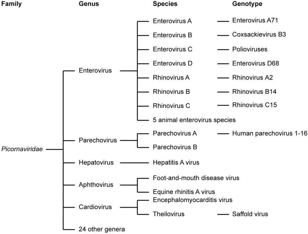 - Knowles, N.J.; Hovi, T.; Hyypiä, T.; King, A.M.; Lindberg, A.M.; Pallansch, M.A.; Palmenberg, A.C.; Simmonds, P.; Skern, T.; Stanway, G.; et al. Picornaviridae. In Virus Taxonomy: Classification and Nomenclature of Viruses: Ninth Report of the International Committee on Taxonomy of Viruses; King, A.M.Q., Adams, M.J., Carstens, E.B., Lefkowitz, E.J., Eds.; Elsevier: San Diego, CA, USA, 2012; pp. 855–880. [Google Scholar]