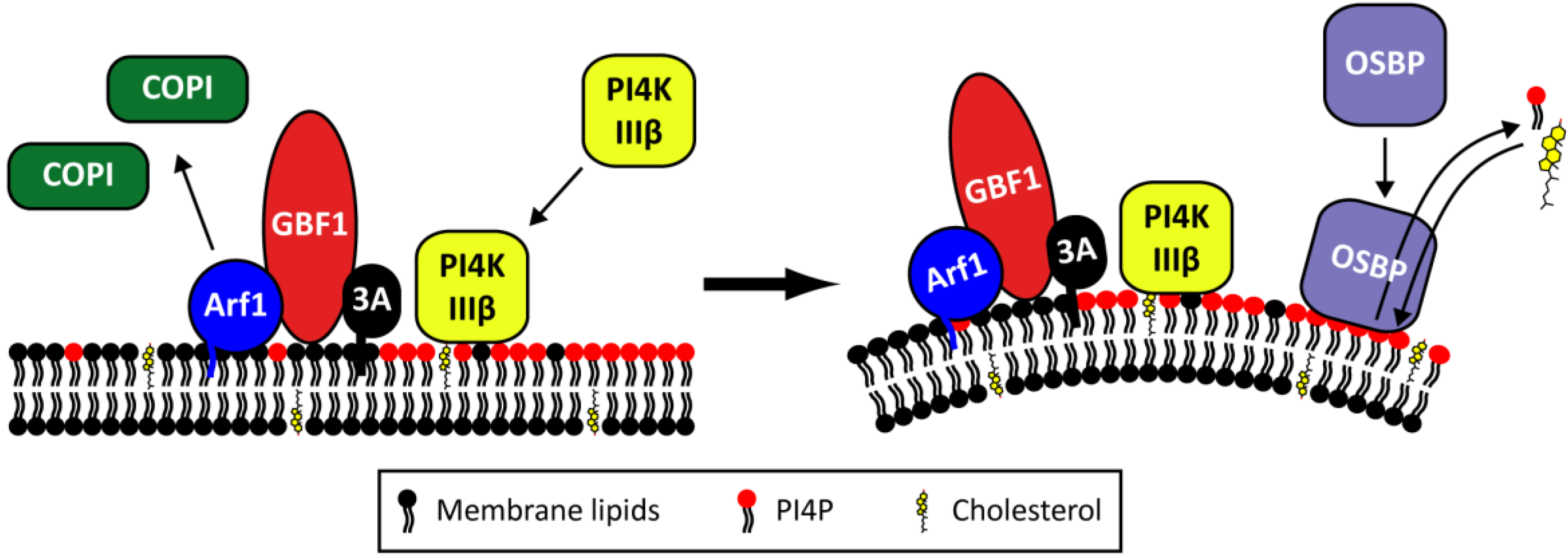 - Dorobantu, C.M.; van der Schaar, H.M.; Ford, L.A.; Strating, J.R.; Ulferts, R.; Fang, Y.; Belov, G.; van Kuppeveld, F.J. Recruitment of PI4KIIIβ to coxsackievirus B3 replication organelles is independent of ACBD3, GBF1, and Arf1. J. Virol. 2014, 88, 2725–2736. [Google Scholar] [CrossRef] [PubMed]