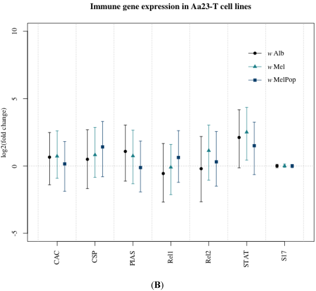 (A) Ratio of Wolbachia genome copies to Ae. albopictus genome copies detected in Aa23-T.wAlbB, Aa23-T.wMel and Aa23-T.wMelPop cell lines. Genome copies were determined by absolute quantification using a standard curve of plasmid DNA containing the genes of interest. Results are from two or three biological replicates; (B) Immune pathway gene transcription in Ae. albopictus Aa23-T.wAlbB, Aa23-T.wMel and Aa23-T.wMelPop cell lines compared to Aa23-T, normalised to the housekeeping gene S17. Points represent the mean of three biological replicates and error bars denote 95% confidence intervals calculated using Bayesian MCMC methods in MCMC.qPCR R package.