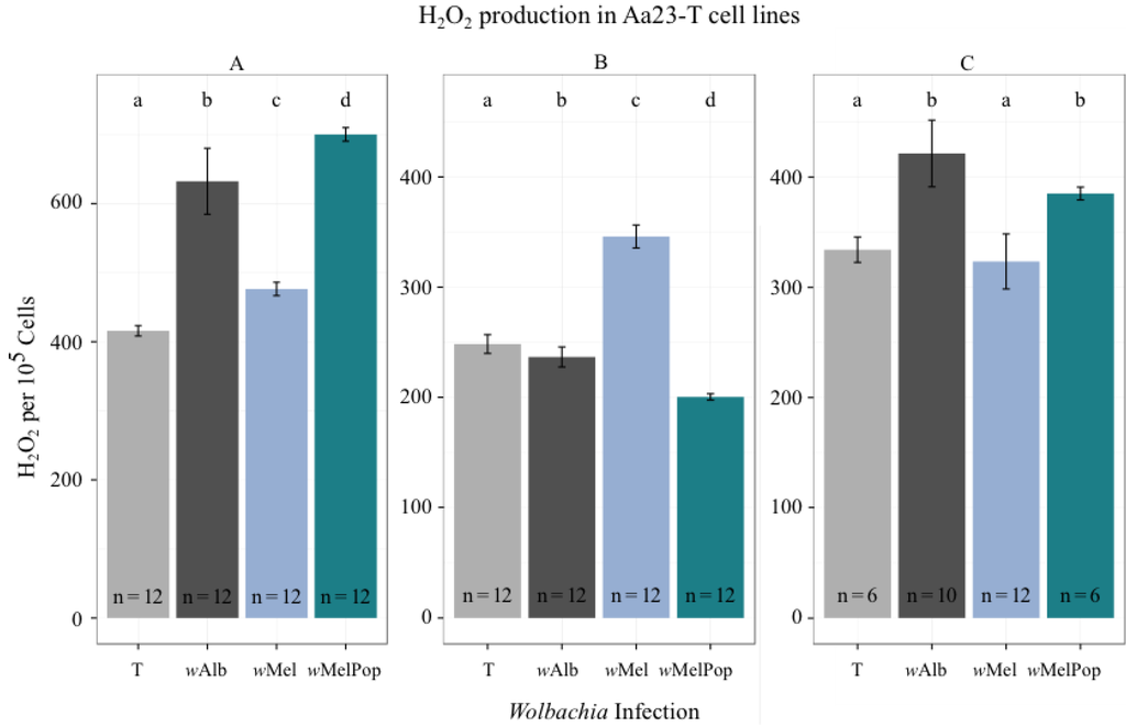 H2O2 detected in Aa23-T cells, normalised to cell count. Graphs A, B and C represent independent experiments. Bars represent mean of n samples as shown and error bars represent the standard deviation of the mean. Lower case letters represent significant pairwise differences at p <0.05 derived from Kruskal-Wallis tests.
