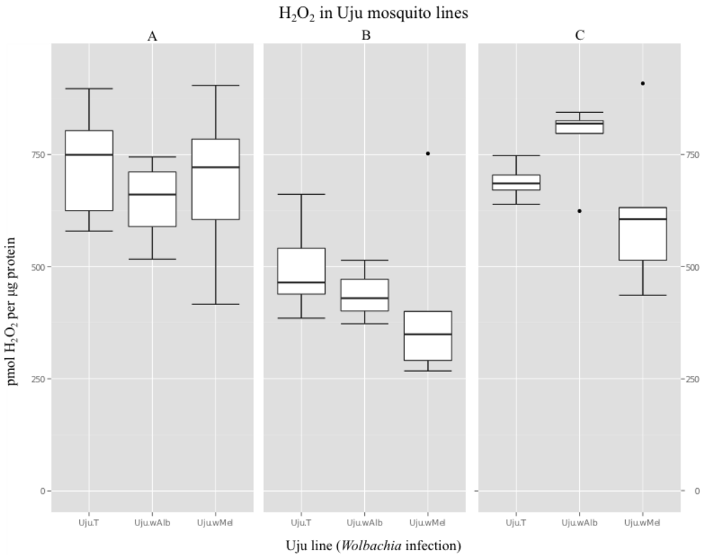 All Uju mosquito and Aa23-T cell lines were assayed for H2O2 to determine if Wolbachia infection increased ROS production and if any effect correlated with Wolbachia density (Figure 3). Relative H2O2 generation in Aa23-T cells across three independent experiments was significantly different between lines as analysed by Kruskal-Wallis testing for non-normal data (A: χ2 = 43.80, df = 3, p-value = 1.67e−09. B: χ2= 41.89, df = 3, p-value = 4.23e−09. C: χ2= 26.04, df = 3, p-value = 9.36e−06). Post-hoc bootstrap ratio testing showed no consistent significant differences between uninfected and infected lines as denoted on Figure 4, with each infected line producing slightly more H2O2 than uninfected in two out of three experiments but slightly less H2O2 in the third. No overall trend towards increased H2O2 in Wolbachia-infected cell lines was thus observed.