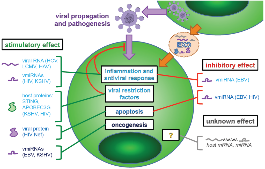 As discussed above, exosomes can transfer RNA species derived from infected cells to neighboring cells, including full-length genomes or dsRNA (see previous Sections). An additional type of RNA, the microRNA (miRNA) is well-known to be transferred from cell to cell by extracellular vesicles, especially by exosomes [,]. This is likely in part because the miRNA machinery is localized within MBVs and, thus, intersects with the exosome biogenesis pathway [,]. Neighboring cells may take up exosome-resident miRNA by fusion of the exosome with the plasma membrane or endocytic membrane [,]. However, this process is presently poorly understood. Here, we present several examples illustrating the potential effects of exosomal-transferred miRNAs on neighboring cells and/or systemic responses in the host during infection. In contrast to previously-discussed exosome-mediated viral genome transfer, transmission of miRNAs can have more widely-ranging effects than only, or primarily, induction of an antiviral response, given the ability of miRNAs to target mRNAs involved in sundry cellular pathways. This exciting and nascent research area in virology is mainly supported by in vitro studies. The in vivo importance of this type of communication is still an uncharted and challenging domain of investigation.