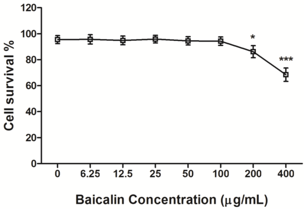 2.3. Cytotoxicity Assay of Baicalin