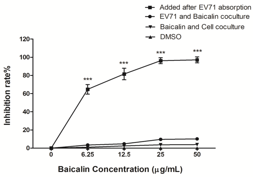 3.3. Time-Course Analysis of Baicalin on EV71 Replication