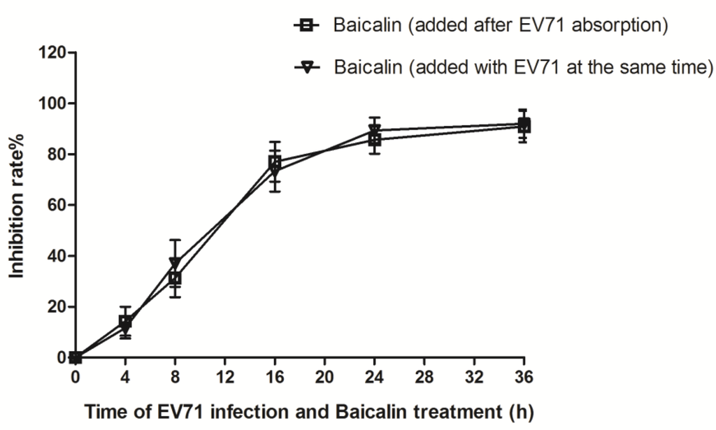 To analyze the antiviral effect of baicalin at what point in the viral replication cycle of EV71, baicalin (50 μg/mL) was added to RD cells at 0 h, 2 h, 4 h, 6 h, 8 h, 10 h, 12 h, 16 h, and 24 h p.i., respectively. Time-course analysis showed that baicalin could remarkably suppress EV71 replication in RD cells at 0–8 h p.i., while only partial or minimal inhibitory effect was observed at 10–24 h p.i. Thus, it is postulated that the effect of baicalin on EV71 mainly occurs in the early stage of virus infection (Figure 4).