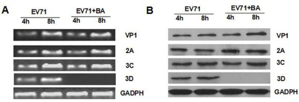 The effects of baicalin on EV71 mRNA and protein. EV71:EV71 infection; EV71 + BA:EV71 infected-RD cells treated with baicalin (50 μg/mL). (A) 3×105 of RD cells were infected with EV71 (MOI = 5) for 1 h and then treated with baicalin or maintenance medium. Total RNA was extracted at 8 h and 24 h p.i. and detected by agarose gel electrophoresis; (B) The total protein of EV71-infected cells was extracted at 8 h and 24 h p.i. and detected by Western blot.