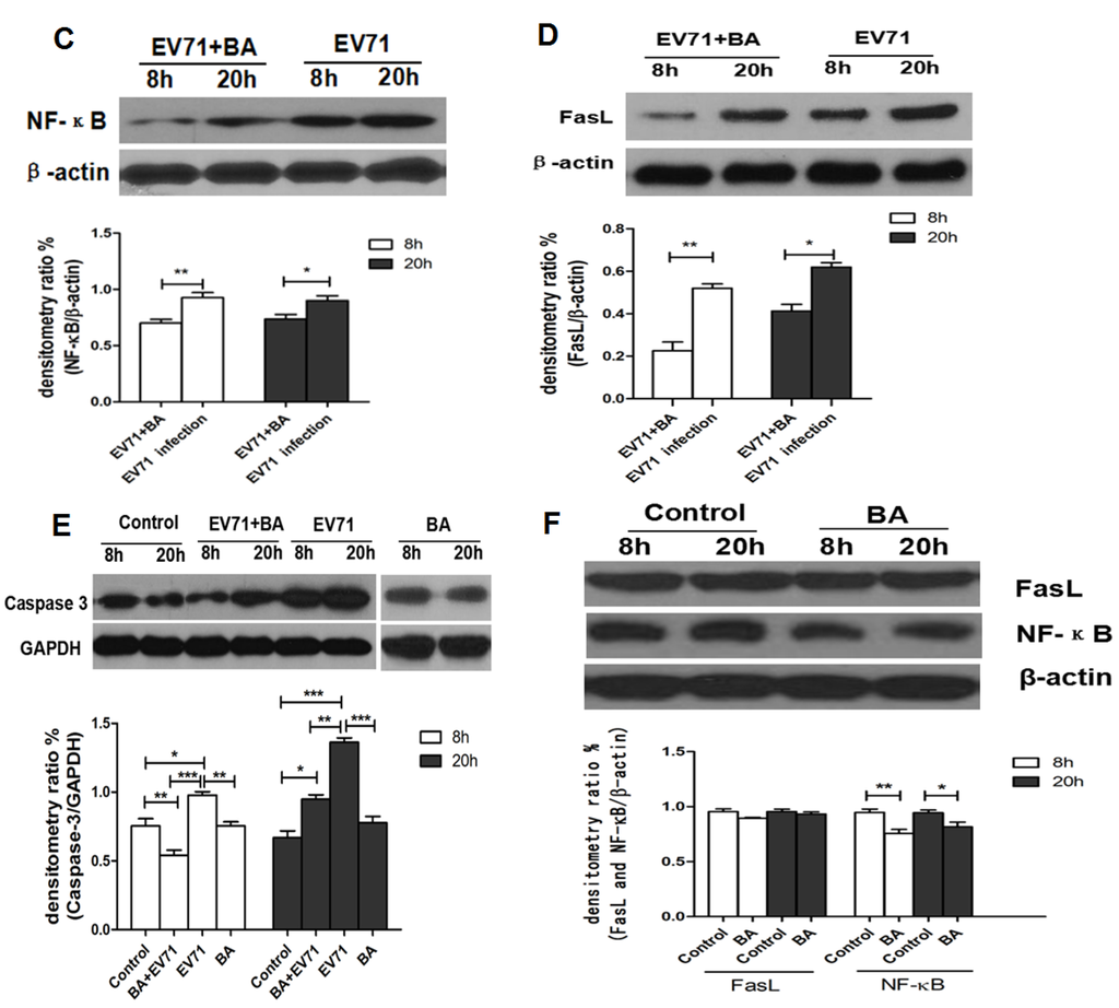 The inhibitory effect of baicalin on EV71-induced apoptosis. Control: Uninfected RD cells; BA: RD treated with baicalin (50 μg/mL); EV71+BA: EV71-infected RD treated with baicalin (50 μg/mL); EV71: EV71-infected RD cells. The apoptosis of EV71-infected RD cells was observed under fluorescence microscopy (A) and detected by flow cytometry (B) at 20 h p.i. Western blot analysis for FasL, caspase-3, and NF-κB in EV71-infected RD cells at 8 h and 20 h p.i. (C–F). ImageJ software was used to quantify protein bands. All data were presented as mean ± SD of three independent experiments and analyzed by one-way ANOVA followed by a Dunnett’s Multiple Comparison Test (* p < 0.05, ** p < 0.01, *** p < 0.001).
