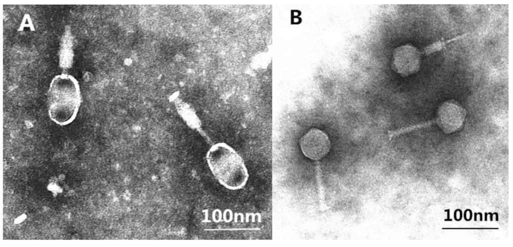 Freshly-purified phage suspended pellets in SM buffer were used in this experiment. A small drop of phage was loaded onto a carbon-coated copper mesh grid and excess phage suspension was removed with filter paper. Negative staining of phages with 1% (w/v) phosphotungstic acid and phage images were obtained by a Transmission Electron Microscope (TEM) (H-7650, Hitachi High-Technologies Corporation, Tokyo, Japan) at an acceleration voltage of 80 kV.