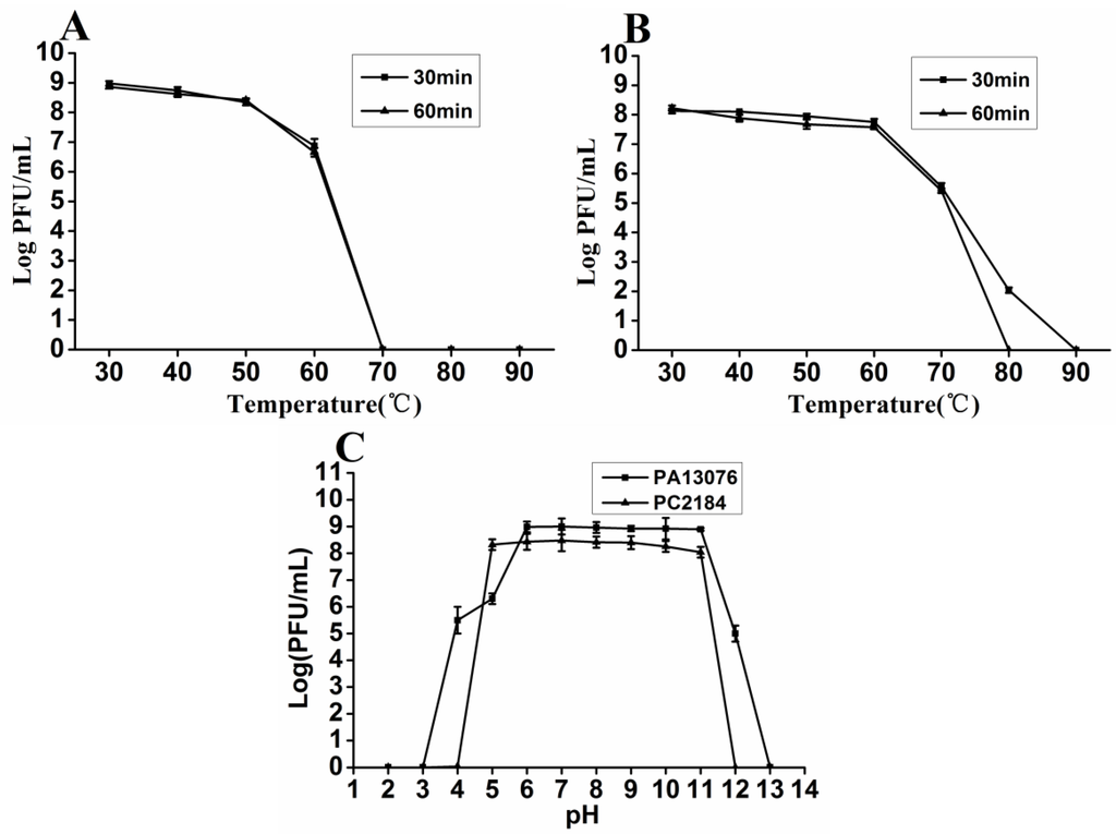 Phage PA13076 and PC2184 were stable between 30 °C to 50 °C for 30 min and 60 min. At 60 °C, there was 2-log reduction for PA13076, whereas PC2184 had only a slight reduction. PA13076 were not detectable at 70 °C and PC2184 were not detectable for 60 min at 80 °C (Figure 2A,B). The titers of phage were relatively stable at pH 6 to 11 for PA13076 and at pH 5 to 11 for PC2184. Their titers declined dramatically under lower or higher pH conditions (Figure 2C).