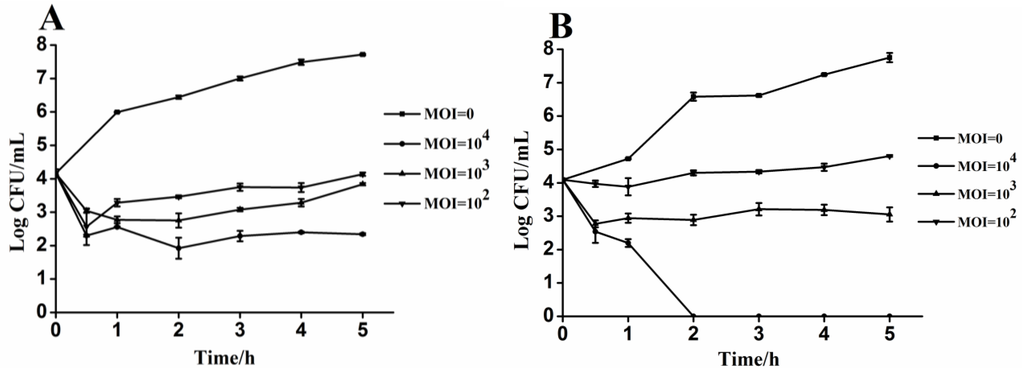 Overnight cultures of Salmonella ATCC13076 and CVCC2184 were diluted to ~104 CFU/mL in fresh medium. A single phage stock (PA13076 or PC2184) was added to give three multiplicity of infection (MOI) of 102, 103 and 104, respectively. The mixtures were then incubated at 37 °C for 5 h with gentle shaking. Phage-free culture (containing only bacteria) and bacteria-free culture (containing only phage) were also included as controls. Bacterial counts were determined at 0, 0.5, 1, 2, 3, 4 and 5 h.