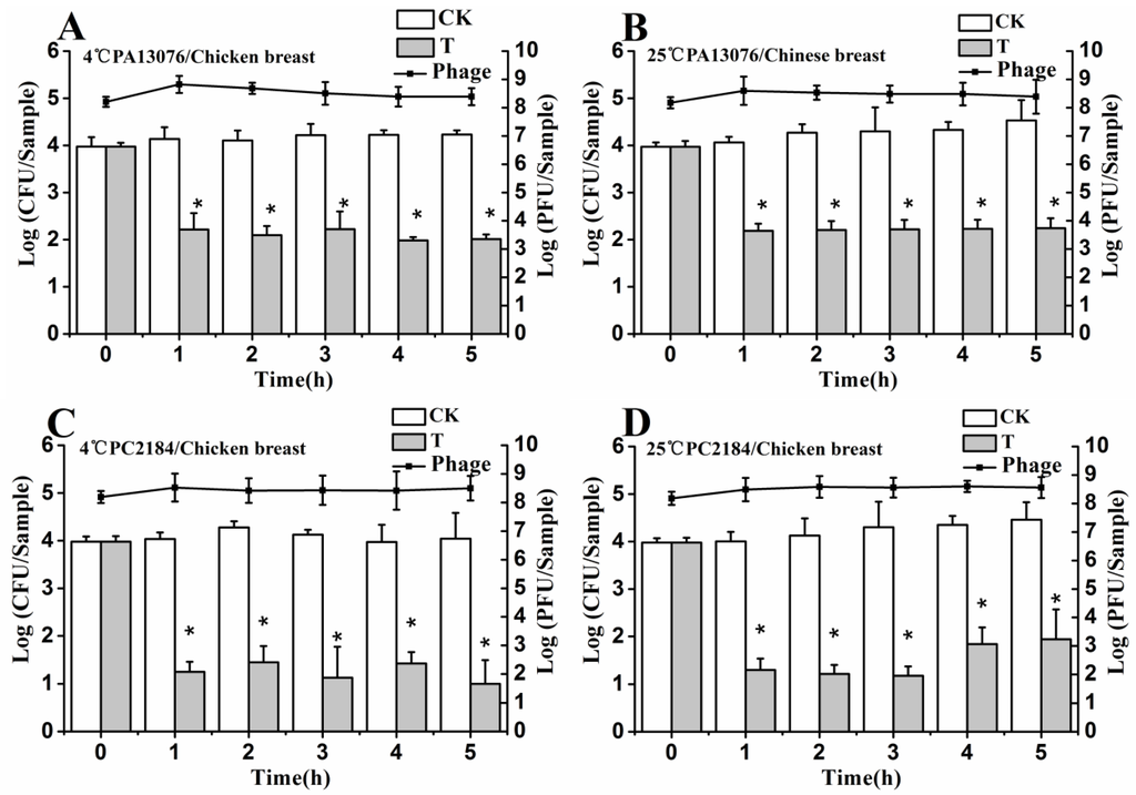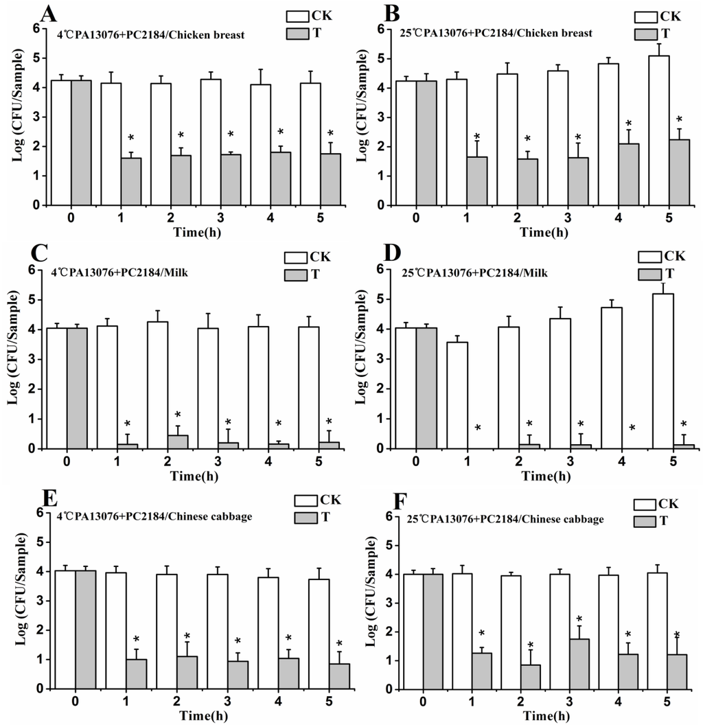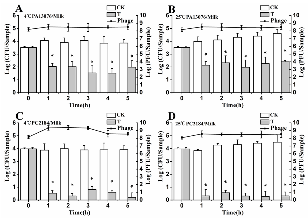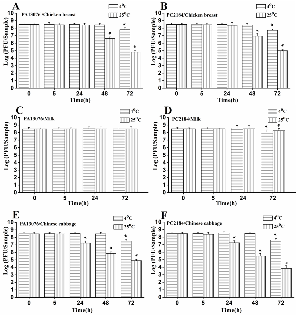 Stability of phage PA13076 and PC2184 over 72 h of incubation on the three kinds of food at 4 °C and 25 °C (the data for the milk sample at 48 h was lacking). Each sample was inoculated with 4 × 108 PFU of phage. Date represent the mean ± S.D. (n = 3), * represents p < 0.05 compared to the original phage numbers (Duncan’s test).