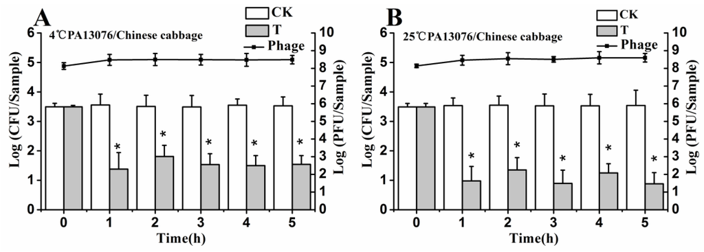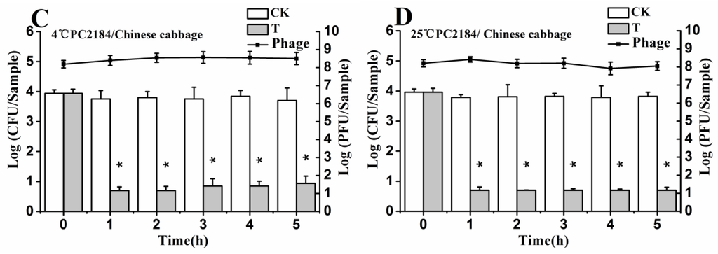In recent years, vegetables have been implicated as potential vehicles of bacterial pathogens, including Salmonella []. In Chinese cabbage bio-control experiment, our results suggested that phage PA13076, PC2184 or the cocktail were each more effective at reducing SE on the surface of Chinese cabbage at 25 °C than at 4 °C, which was opposite to the effects in chicken breast and pasteurized whole milk. This indicates that successful phage bio-control depends on the food matrix and temperature. Previous studies also found that the phage activity was sensitive to the physiological state of the host, which can be affected by growth conditions such as temperature, nutrient availability and oxygen tension [,]. These same studies showed that phage ECP-100 application significantly reduced the concentration of viable E. coli organisms on tomato slices by ca. 99% during storage (10 °C) for 24 h [].