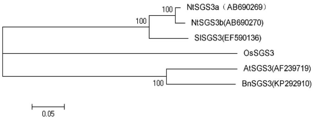 Analysis of phylogenetic relationships would help provide initial insights into degree of structural and functional conservation. Several plant SGS3 genes, initiated from Arabidopsis thaliana (AtSGS3) [], Solanum lycopersicum (SlSGS3) [], Oryza sativa (OsSGS3) [], and Nicotiana tabacum (NtSGS3) [] were implicated in plant viral resistance. Based on alignments, neighbor-joining tree of SGS3 nucleotide sequences was generated (Figure 1). Results showed that there were three distinct clusters of these SGS3 genes. The homology was 55.1%–81.0% between BnSGS3 and other SGS3 genes. BnSGS3 was more closely related to AtSGS3 but distantly to those of N. tabacum, S. lycopersicum and O. sativa. BnSGS3 and AtSGS3 belonged to one cluster and they shared the highest homology of 81.0%. The difference between them might relate to the potentially resistance to different viruses.