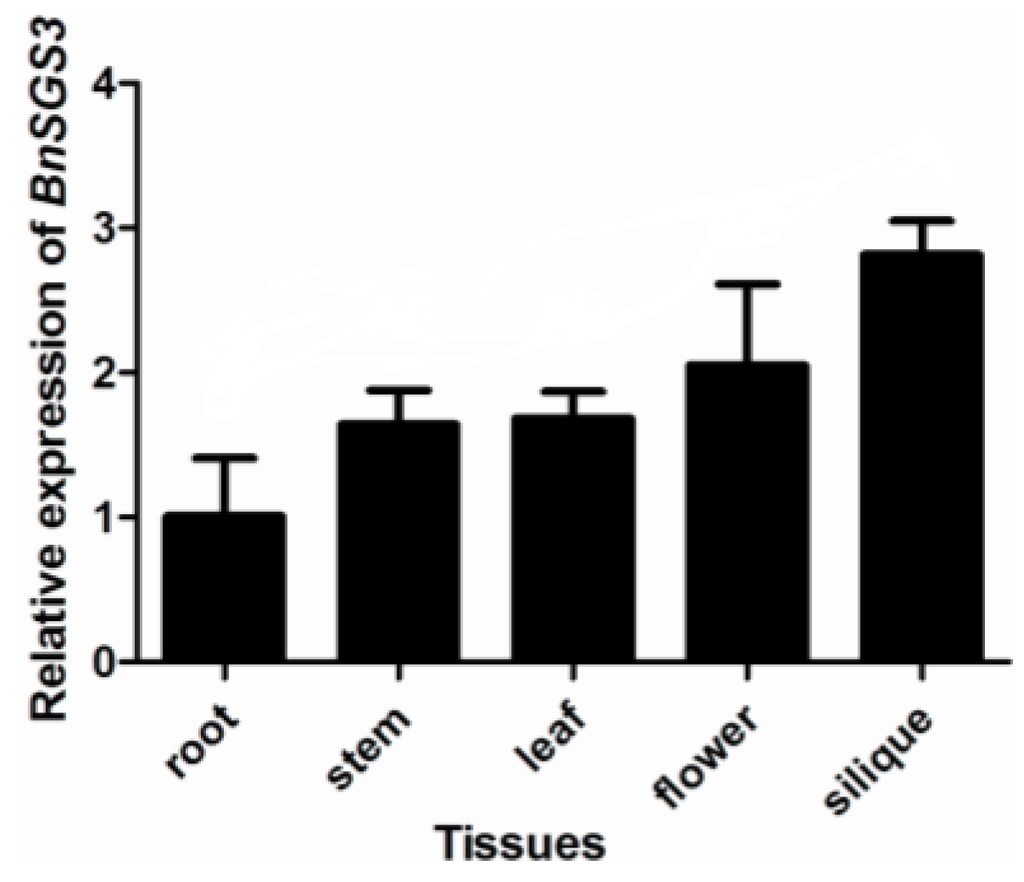 Quantitative RT-PCR (qRT-PCR) was used to detect the expression levels of endogenous BnSGS3 in different tissues of oilseed rape (B. napus cv. Zhongshuang No. 6). When the expression level of BnSGS3 in roots was designated to be 1, the relative expression level in each tissue from high to low followed: Siliques (2.81), flowers (2.05), leaves (1.68), stems (1.64) and roots. The relative expression of BnSGS3 in roots was only 35% of that in siliques (Figure 2).