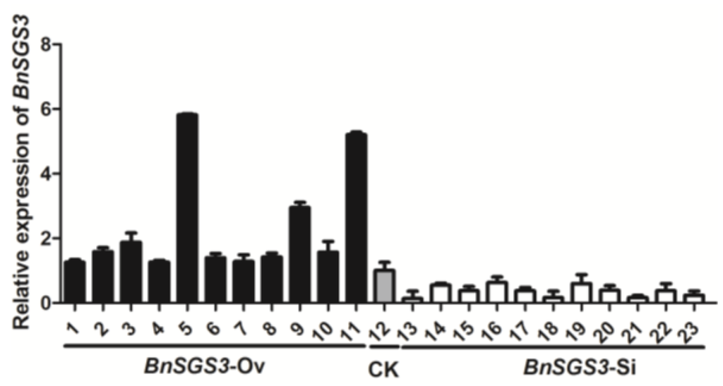 2.2. BnSGS3 Expression in Transgenic and Non-Transgenic Plants of Oilseed Rape