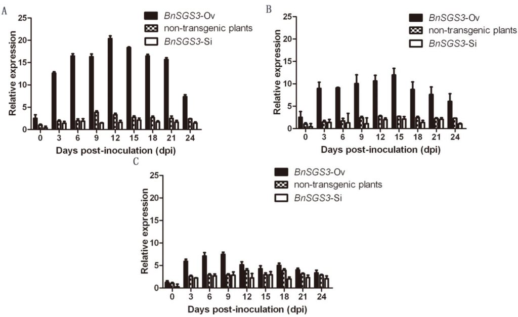 Dynamic expression of BnSGS3 induced by (A) Oilseed rape mosaic virus (ORMV); (B) Turnip mosaic virus (TuMV) and (C) Cucumber mosaic virus (CMV) in the transgenic and non-transgenic plants. The expression level of BnSGS3 in non-transgenic plants uninoculated was designated to be 1.