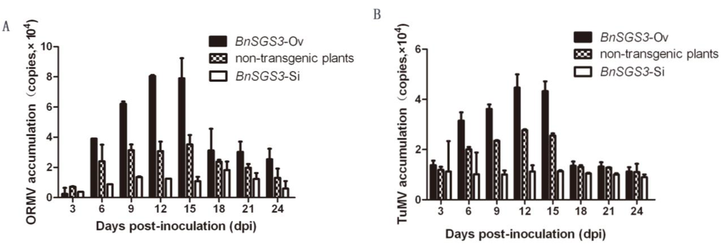 The replication rate of CMV in BnSGS3-Ov plants was small and its accumulation levels were low, reaching a peak of 1.50 × 103 copies at 24 dpi, and the amplitude of variation of qRT-PCR throughout the entire test time course was small. In inoculated non-transgenic and BnSGS3-Si plants, increase of CMV levels was relatively quick, reaching a peak of 1.48 × 104 copies and 2.34 × 104 copies at 3 dpi, respectively. The levels fluctuated a bit, but the changes were small (Figure 5C). In non-transgenic oilseed rape, CMV levels were much higher with 1.5 × 104 copies than that of ORMV at 3 dpi and afterwards virus quantities were ORMV > TuMV > CMV. The general trend of CMV accumulation was the BnSGS3-Si > non-transgenic plants > BnSGS3-Ov, in contrary to both the induction expression trend of BnSGS3 and the accumulation trends of ORMV and TuMV. Furthermore, virus accumulation of ORMV and TuMV in the BnSGS3-Ov are drastically higher than that of CMV at 6 dpi and afterwards.