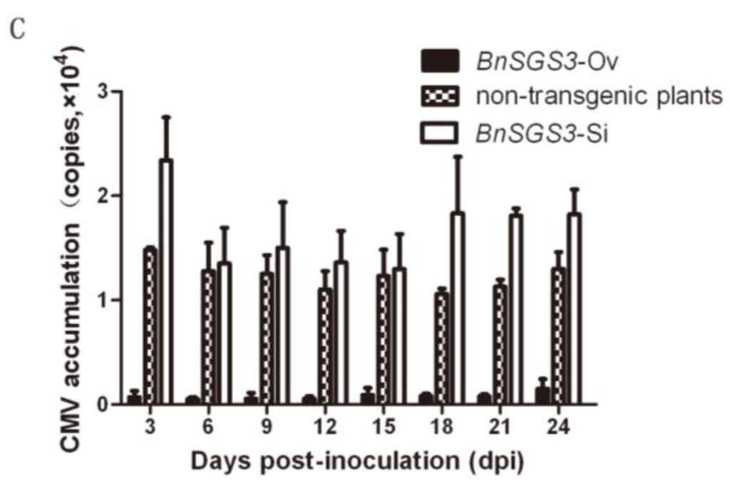 To investigate whether the BnSGS3 expression effect the viral accumulation, five T0 generation transgenic and non-transgenic plants were inoculated with 50 ng of the purified ORMV, TuMV and CMV particles at the four-leaf-stage. The viral accumulation was measured in 0–24 days of post-inoculation (dpi) at intervals of three days. After inoculation of BnSGS3-Ov, oilseed rape plants with ORMV and TuMV, virus levels first increased and then decreased, reaching peak values of 8.05 × 104 copies and 4.47 × 104 copies at 12 dpi, respectively. In non-transgenic oilseed rape, the virus levels initially increased, reaching peak values of 3.52 × 104 copies and 2.77 × 104 copies at 15 and 12 dpi, respectively, followed by a decrease. However, in BnSGS3-Si oilseed rape inoculated with ORMV and TuMV, the virus levels reached peak values of 1.82 × 104 copies and 1.14 × 104 copies at 18 and 15 dpi, respectively. These results demonstrate that the quantities of ORMV and TuMV exhibited a trend: BnSGS3-Ov plants > non-transgenic plants > BnSGS3-Si plants (Figure 5A,B), consistent with BnSGS3 expression levels in these type plants.