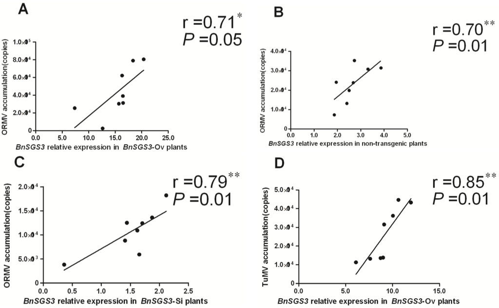 SPSS17.0 statistical software was used to analyze the relationship between virus accumulation and BnSGS3 expression levels in transgenic and non-transgenic oilseed rape. There was a positive and significant (p < 0.01 or 0.05) linear correlation between the accumulation of ORMV and TuMV (in transgenic and non-transgenic plants) and BnSGS3 expression (Figure 6A–F). However, the relationship between CMV accumulation and BnSGS3 expression in transgenic and non-transgenic oilseed rape exhibited a negative and significant (p < 0.01 or 0.05) linear correlation (Figure 6G–I). These results indicated that the expression of BnSGS3 promoted the accumulation of ORMV and TuMV but suppressed CMV accumulation.