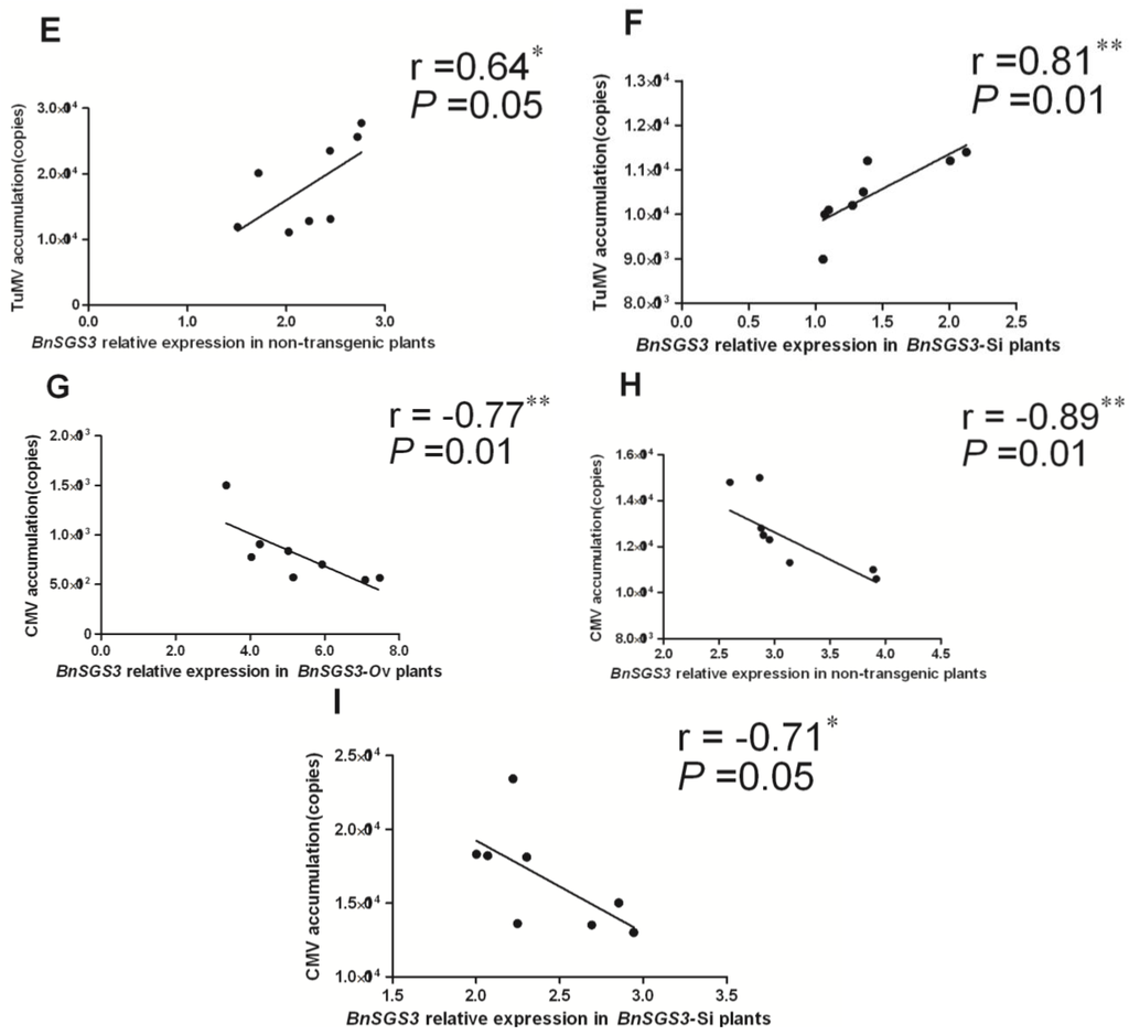 Relationship between the accumulation level of ORMV (A–C), TuMV (D–F) or CMV (G–I) and the expression quantity of BnSGS3 in BnSGS3-Ov (A,D,G), non-transgenic (B,E,H) and BnSGS3-Si (C,F,I) plants.