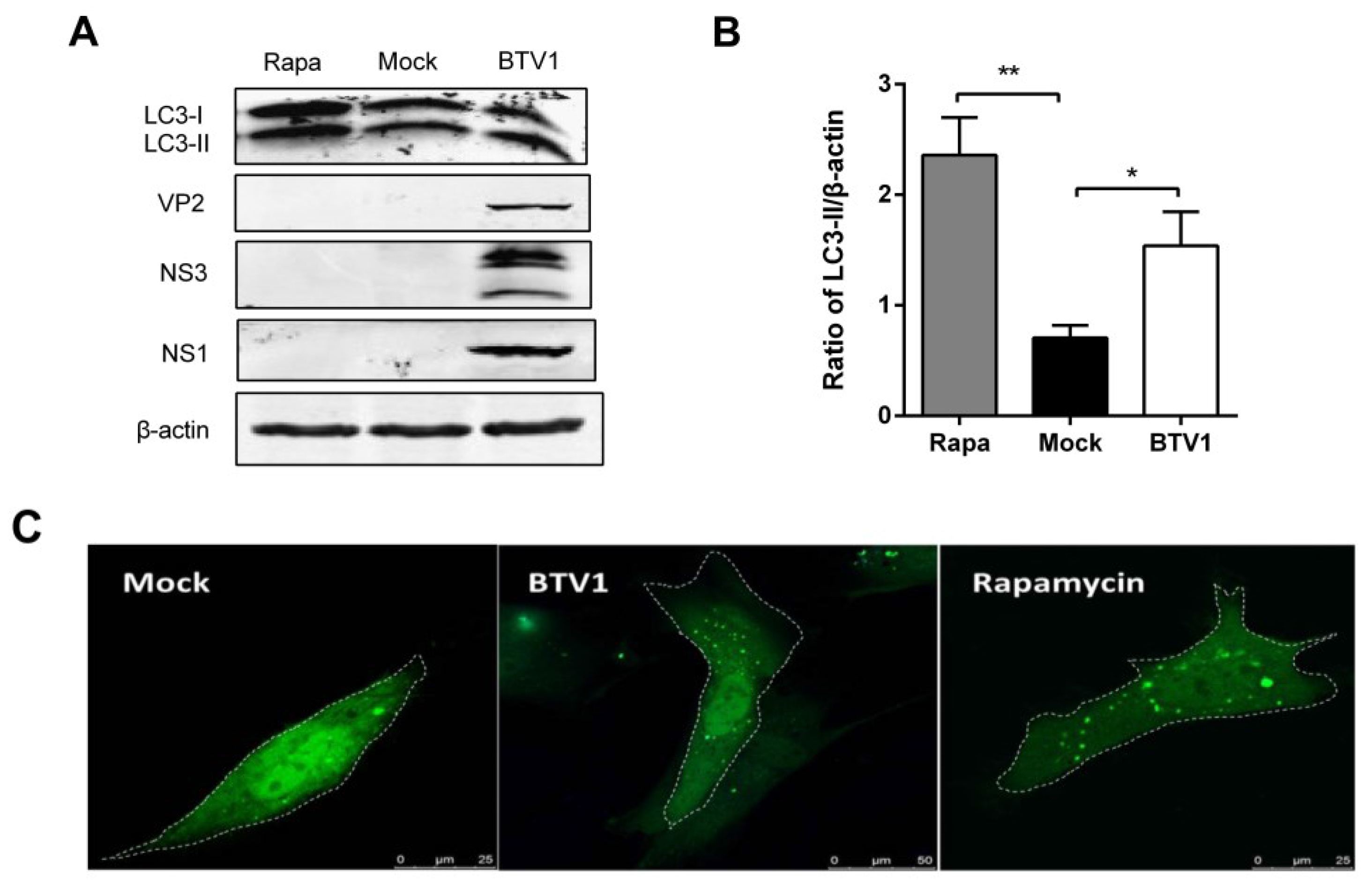 Next, to further verify the observations above, the formation of GFP-LC3 dots was investigated after the pEGFP-LC3-transfected BSR cells were infected or mock-infected with BTV1 for 24 h. As presented in Figure 1B, NS1 expression of BTV1 firstly suggested the cells were indeed infected with BTV1, and a considerable number of punctate GFP-LC3 proteins accumulated in infected cells compared with the uninfected cells. The GFP-LC3 dots induced by rapamycin were used as a positive control.