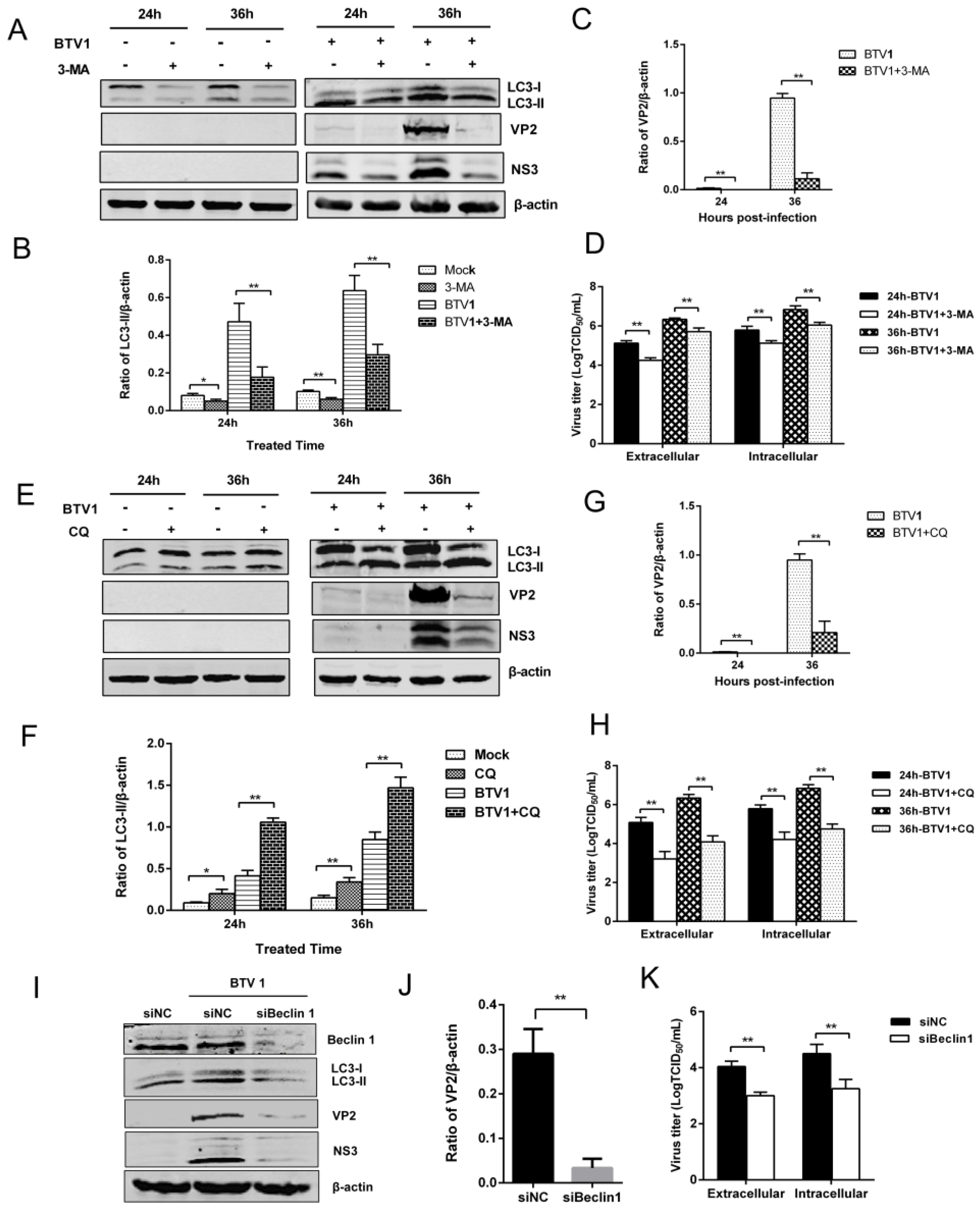 Autophagy inhibition reduced the replication of BTV1. (A,E) Effects of 10 mM 3-MA or 20 μM CQ treatment on LC3-II accumulation and VP2 or NS3 expression. The expression of relative proteins were analyzed by immunoblotting with specific antibodies; (B,F) Representative results are shown with graphs representing the intensity of LC3-II/actin; (C,G) Representative results are shown with graphs representing the intensity of VP2/actin. (D,H) Effects of 10 mM 3-MA or 20 μM CQ on the production of infectious particles of BTV1. The extracellular and intracellular virus loads were tested as TCID50/mL at 24 hpi and 36 hpi, respectively; (I) The effects of Beclin1 silencing on LC3-II and VP2 or NS3 expression. BSR cells were transfected with either specific siRNA targeting Beclin1 or negative control siRNA. At 24 h after transfection, the cells were incubated with BTV1 (MOI = 1). Samples were collected 24 hpi and analyzed by Western blotting with antibodies against Beclin1, LC3, VP2, and NS3; (J) Representative results are shown with graphs representing the intensity of VP2/actin; (K) The viral titers were determined as TCID50/mL at 24 hpi. Data represent the mean ± SD of three independent experiments. * p < 0.05 and ** p < 0.01, significantly different.