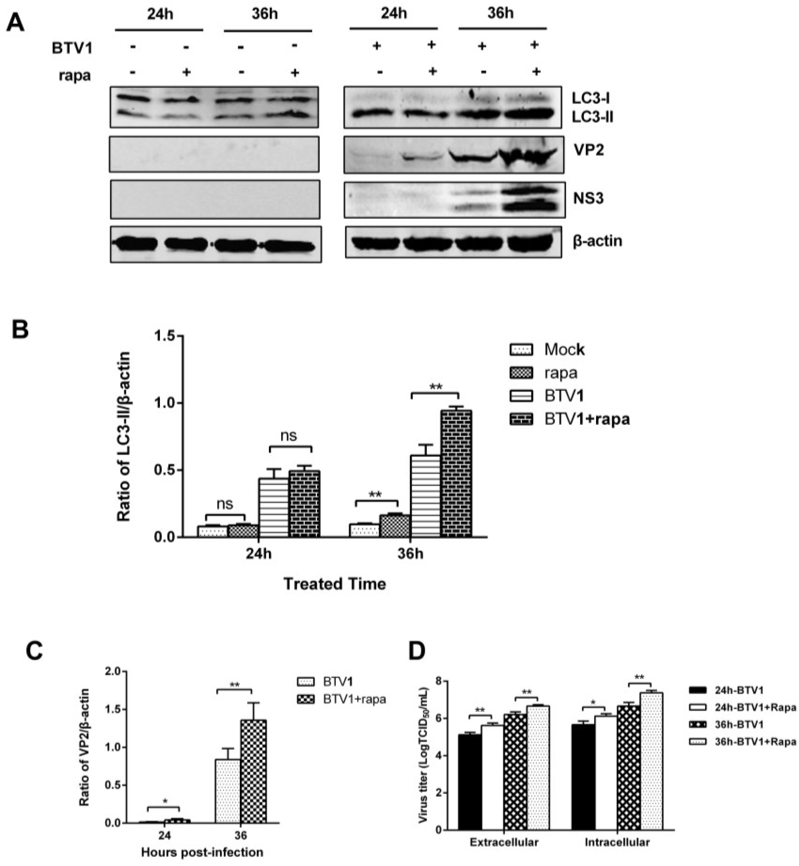 Induction of autophagy with rapamycin enhanced the replication of BTV1. (A) Effects of 100 nM rapamycin treatment on LC3-II accumulation and VP2 or NS3 expression. The intensity ratios of proteins relative to β-actin are presented below the blots; (B,C) Representative results are shown with graphs representing the intensity of LC3-II/actin or VP2/actin bands; (D) The titers of BTV1 produced by rapamycin-treated BSR cells. The virus yields were shown as TCID50/mL at 24 hpi and 36 hpi. Results represent the mean ± SD of triplicate experiments. * p < 0.05 and ** p < 0.01, significantly different; ns, no significant difference.