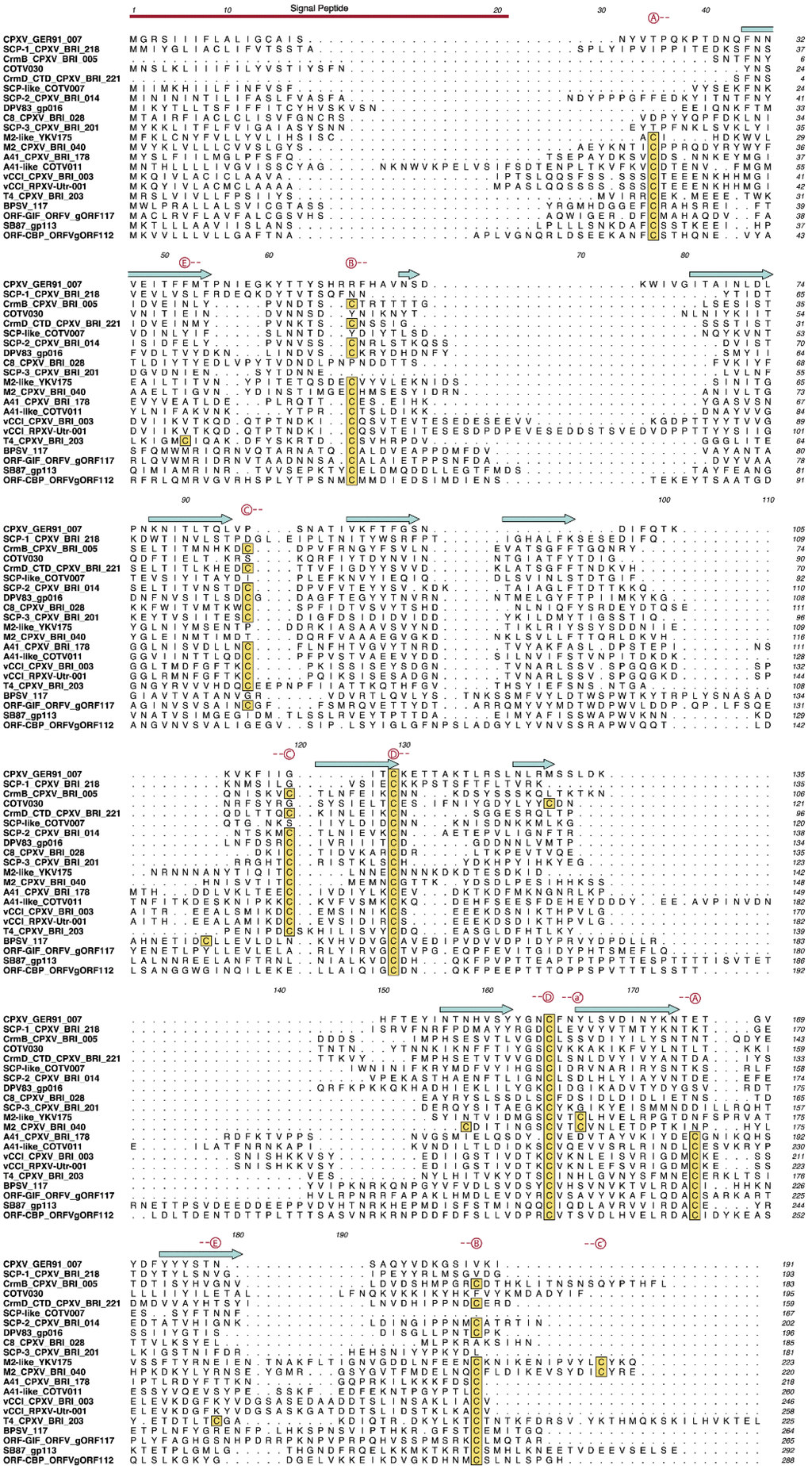 | Genus | Strain | vCCI | CrmB | SCP-2 | C8 | M2 | A41 | SCP-3 | T4 | SCP-1 | CrmD | COTV030 | CPXV-007 | SCP-like | M2-like | A41-like | ORF-CBP | SB87-113 | DPXV-016 | BPSV-117 | ORF-GIF |