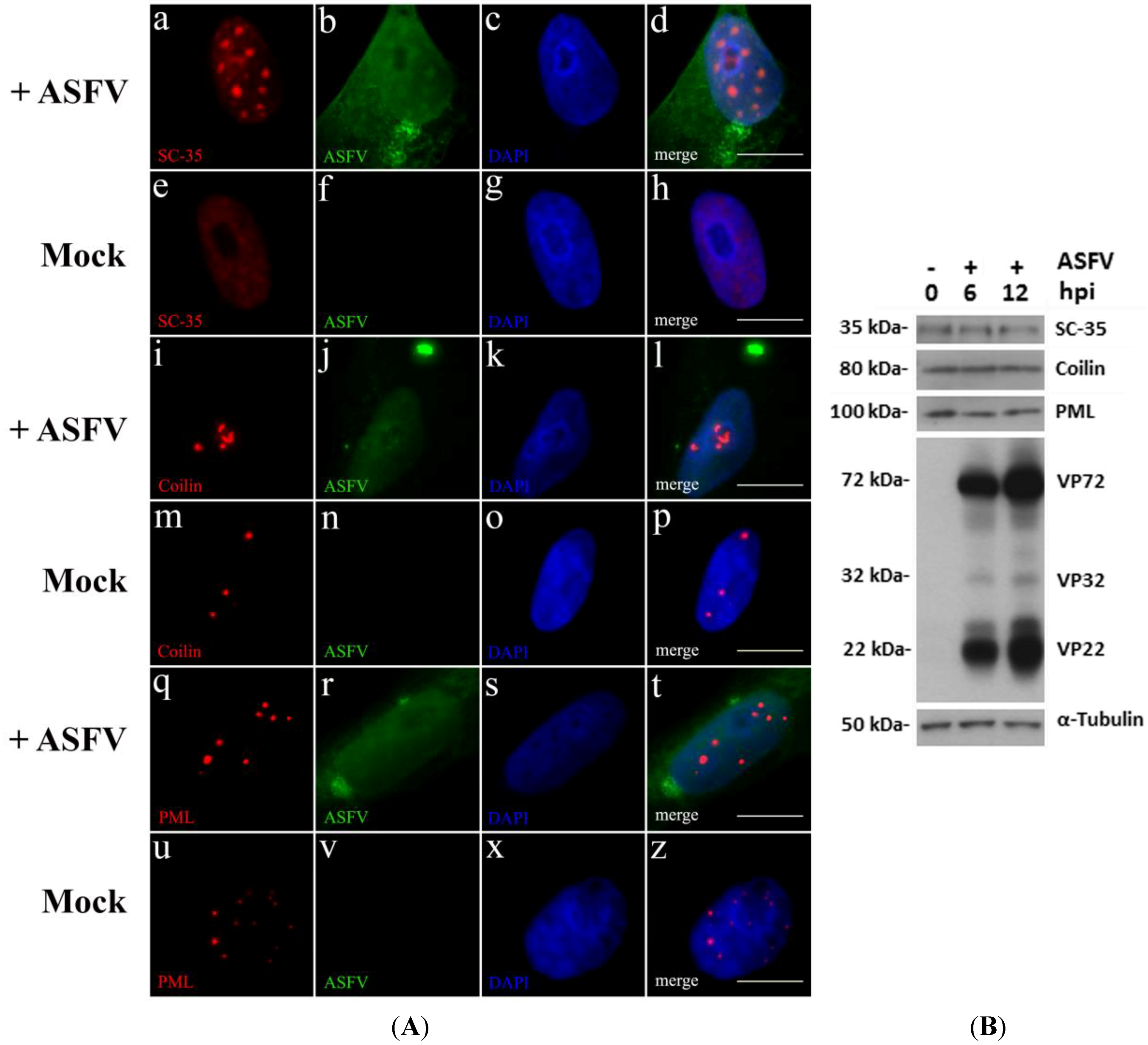 (A) ASFV induces the reorganization of subnuclear domains. Vero cells were infected with ASFV Ba71V isolate (MOI of 5), fixed at 6 hpi, permeabilized and immunostained; cell nuclei stained with DAPI (blue). (a–d) ASFV-infected cells (green) reveal globular and enlarged accumulations of SC-35 (red), while in non-infected cells (e–h), nuclear speckles (SC-35) show a pan-nuclear staining. (i–l) In ASFV-infected Vero cells (green), Cajal bodies (coilin, red) display “comma-shaped” morphology and group together, contrasting with the few pin-point bright foci of non-infected cells (m–p). (q–t) PML-NBs (PML, red) of infected cells (green) reveal fewer and enlarged domains, when compared to non-infected cells which show an increased number of smaller dots (u–z). Scale bar, 10 μm. Representative images of at least three independent experiments are shown; (B) Protein levels of SC-35, coilin and PML remain constant during ASFV infection. Vero cells infected with ASFV Ba71V isolate were lysed at 6 and 12 hpi, and compared to mock-infected cells, using immunoblotting analysis. α-Tubulin was used as loading control. Molecular weights (kDa) of evaluated proteins are indicated on the left of immunoblot images.
