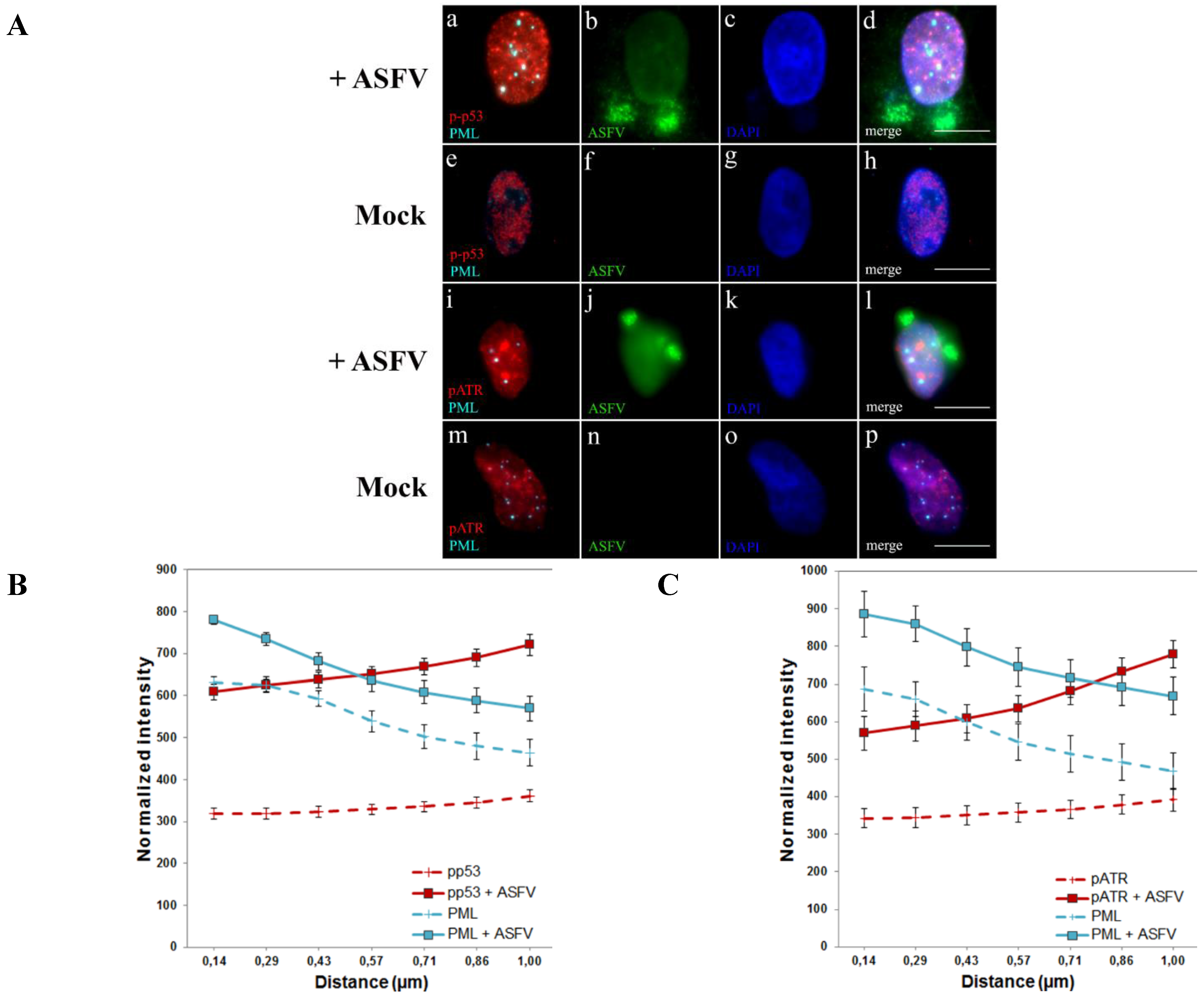 We analysed the redistributions quantitatively using a radial intensity profiling algorithm that measures the normalized integrated fluorescence intensity in immunostaining images of PML-NBs and DDR-related factors (p-p53 and pATR) from the subnuclear domains centre to a maximum radius distance of 1 µm (10 pixel). Radial profiles were obtained from 50 nuclei of ASFV-infected cells (solid lines) and 50 nuclei of non-infected cells (dashed lines) and average normalized integrated intensities were plotted as a function of distance. The results confirmed that the proximity between PML-NBs and pATR (Figure 2C), as well as the juxtaposition among PML-NBs and p-p53 foci (Figure 2B) occurs much more frequently in infected cells (solid lines), where the fluorescence intensity values of both PML-NBs (cyan lines) and DDR-related factors (red lines) are higher than in non-infected cells, meaning that ASFV infection orchestrates the nuclear distribution of PML-NBs and ATR-related factors.