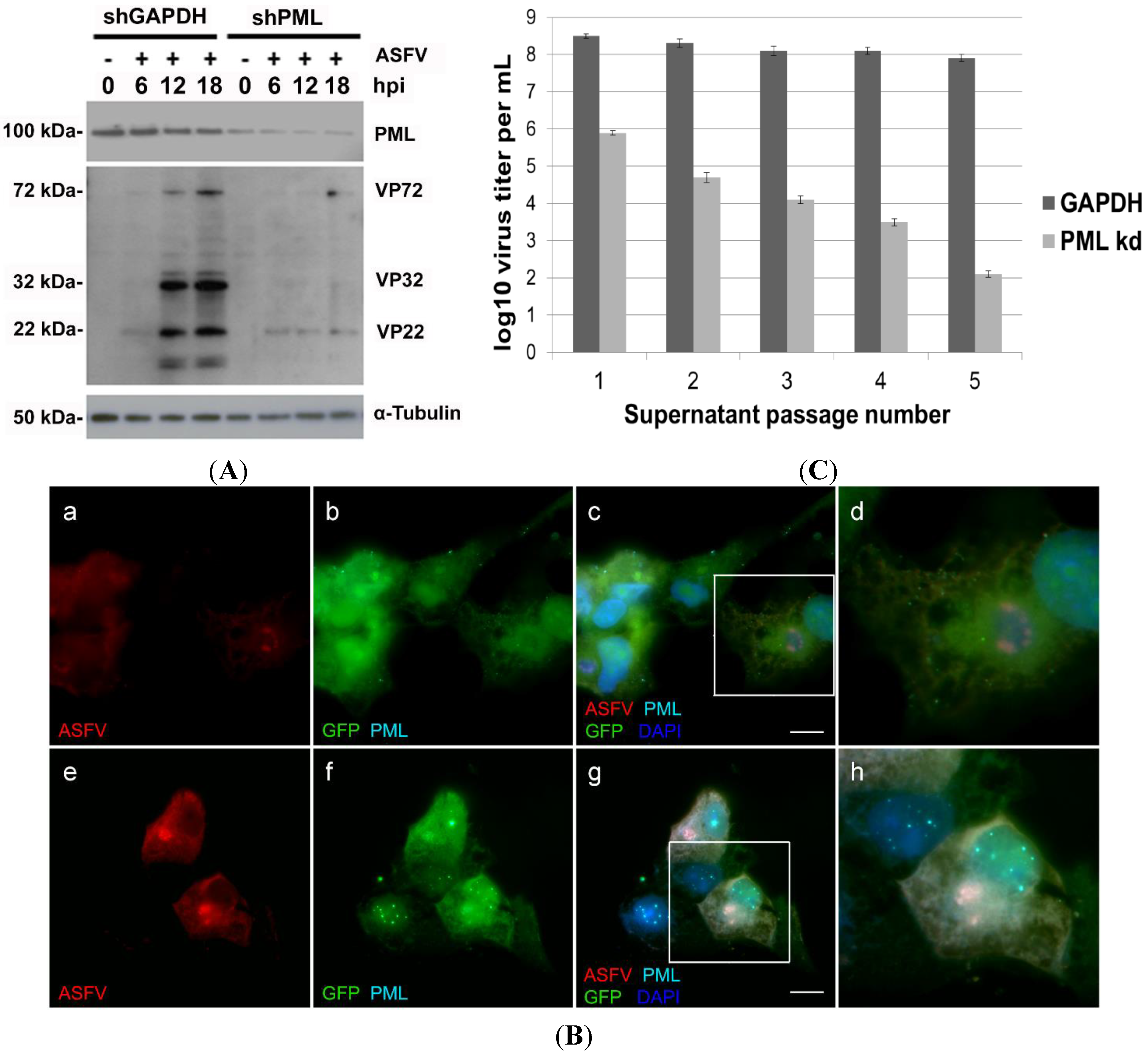 Immunofluorescence analysis of Vero-shRNA-PML cells revealed irregularly shaped viral factories (Figure 3B, a–d), again contrasting with Vero-shRNA-GAPDH cells that presented typical round-shaped factories and virus-induced PML-NBs disruption (Figure 3B, e–h). To further address whether ASFV infection is PML-dependent, viral yields obtained from Vero-shRNA-PML and Vero-shRNA-GAPDH cells were titrated. Initial ASFV Ba71V inoculum (MOI of 1) was adsorbed for 1 h and supernatants collected every 48 hpi were used for further passages, while a small aliquot was stored at −80 °C for subsequent viral titration [46]. Results showed that ASFV yields decrease six logs after five sequential passages in PML-knockdown cells, unlike the viral titers obtained from Vero-shRNA-GAPDH cells (p < 0.05). Titration results from three independent experiments are depicted graphically in Figure 3C.
