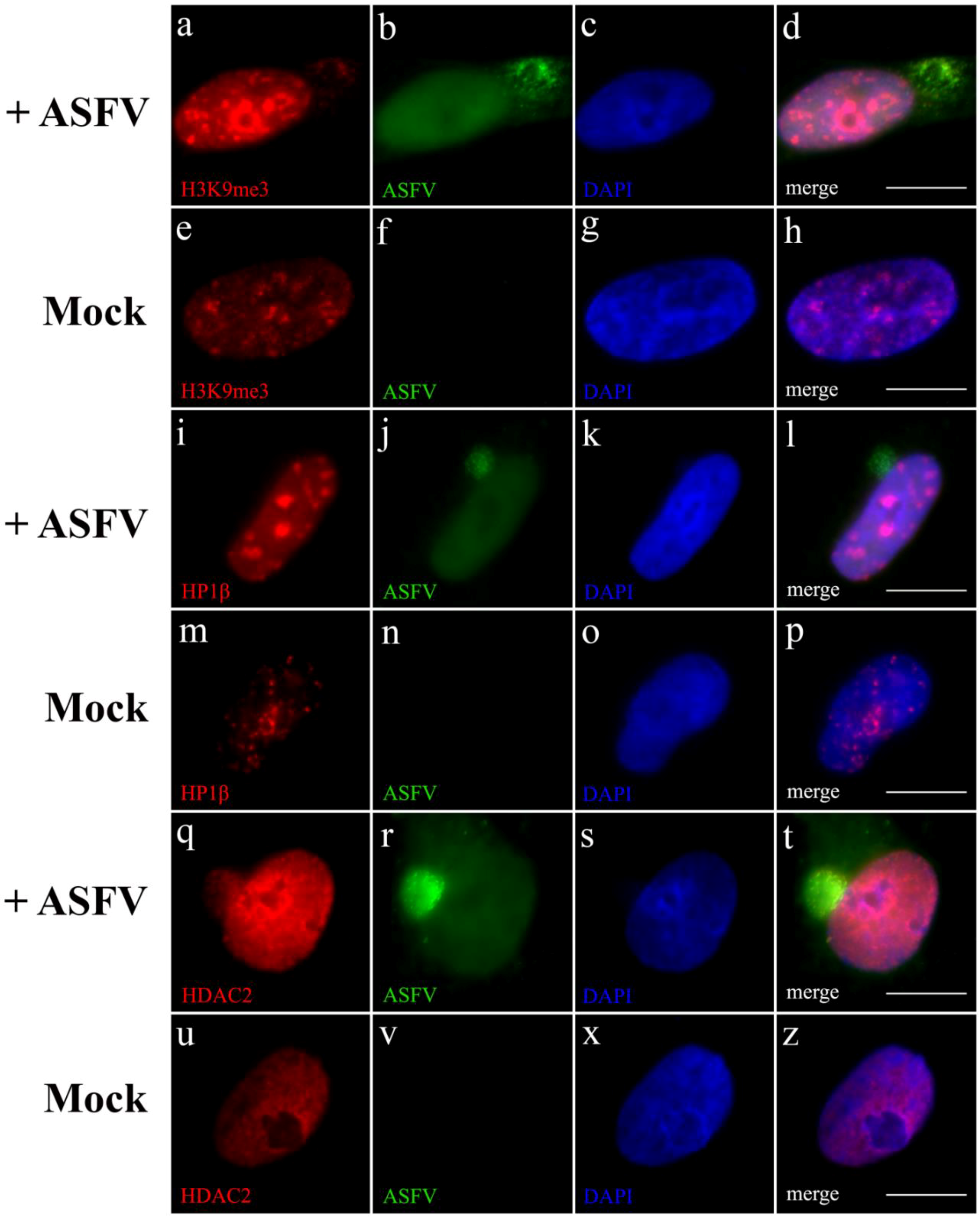 ASFV modifies the host chromatin state. Immunofluorescence analysis was performed on non-infected and ASFV-infected Vero cells (8 hpi) using specific antibodies recognizing heterochromatin marks—H3K9me3, HP1β and HDAC2 (red) and viral proteins (green). Cell nuclei were counterstained with DAPI (blue). (a–d) Histone H3 trimethylated at lysine 9 (H3K9me3, red) show large accumulations throughout the nucleoplasm upon ASFV infection (green), not observed in uninfected cells (e–h). ASFV-infected cells (green) also present HP1β (red) nucleoplasmic accumulations (i–l), not detected in non-infected cells (m–p). HDAC2 (red) is the only member of HDACs family that displays a more intense nuclear labelling in ASFV-infected cells (green), and additional recruitment to viral cytoplasmic factories (q–t), when compared to non-infected cells (u–z). Scale bar, 10 μm. Representative microscopy images of at least three independent experiments are shown.