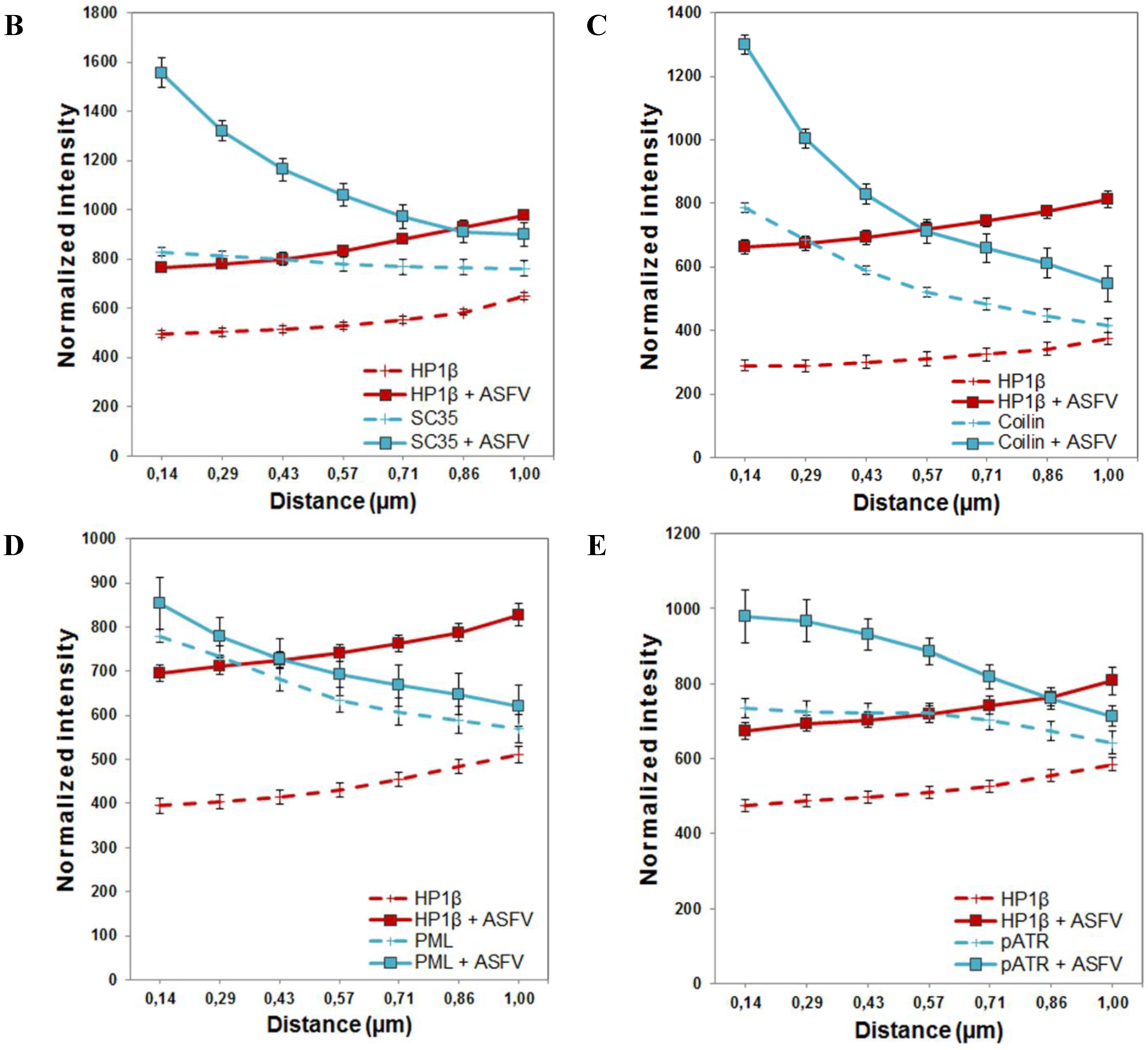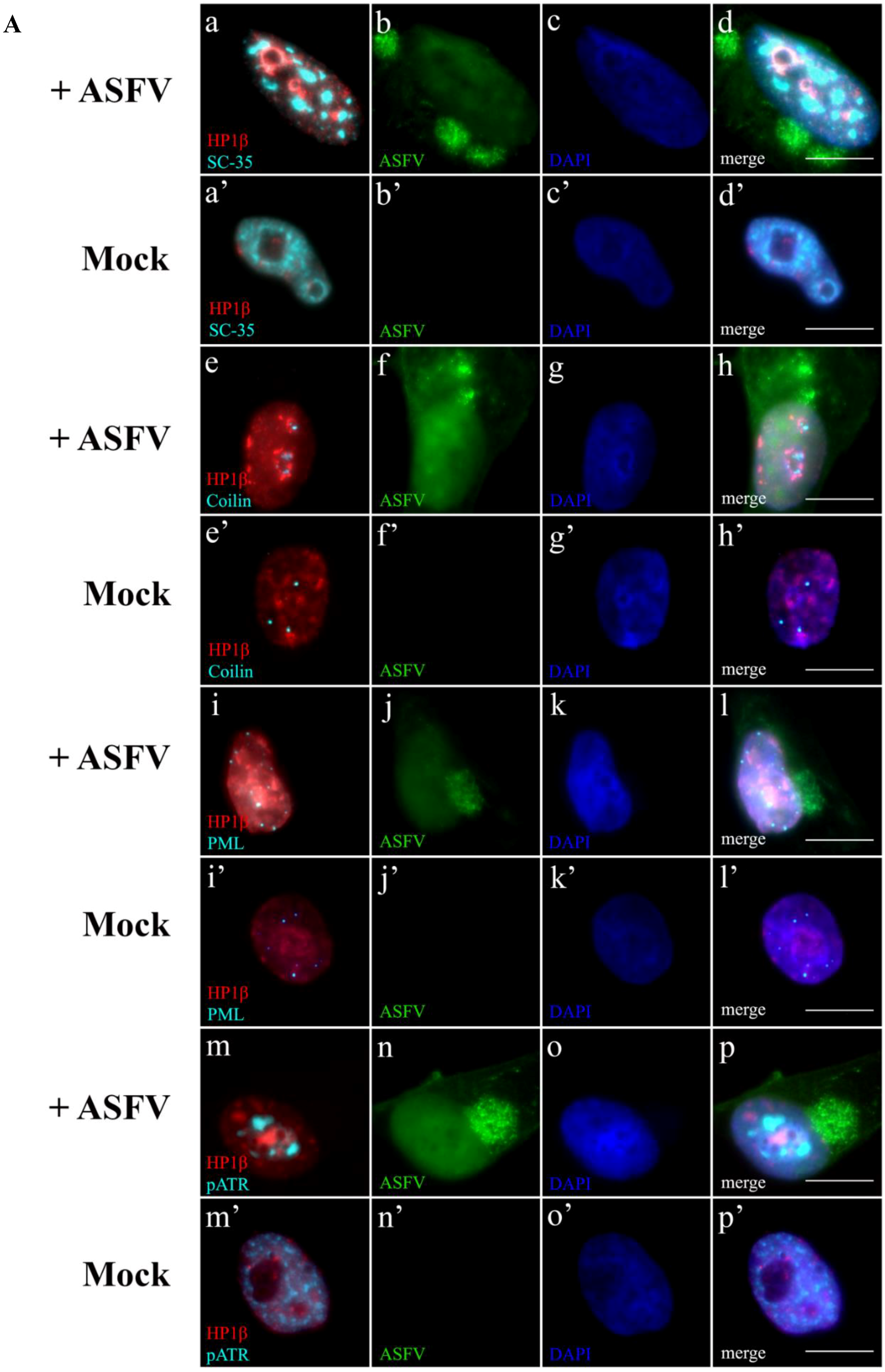 ASFV leads to juxtaposition of host heterochromatic regions, disrupted subnuclear domains and pATR foci. (A) Heterochromatin marker HP1β is labelled in red, while subnuclear domains (PML-NBs, nuclear speckles or Cajal bodies) and the activated ATR kinase are labelled in cyan. Cell nuclei were counterstained with DAPI (blue). (a–d) Only ASFV-infected cells (green) display the speckled pattern of enlarged SC-35 accumulations (cyan) juxtaposed to the heterochromatic regions (HP1 β, red), as non-infected cells do not reveal the close proximity pattern (a’–d’). In contrast to non-infected cells (e’–h’), the ASFV-induced bulky heterochromatic territories (HP1β, red) are always present within close vicinity to disrupted Cajal bodies (cyan) (e–h). Enlarged heterochromatic regions (HP1β, red) closely neighbour reorganized PML-NBs (cyan) in infected cells (green) (i–l), rearrangements not observable in non-infected cells (i'–l’). HP1β deposits (red) juxtapose to pATR foci (cyan), in ASFV-infected cells (green) (m–p), different chromatin/pATR appearances and distributions in non-infected cells (m’–p’). Scale bar, 10 μm. Representative microscopy images of at least three independent experiments are shown; (B–E) Relative distance between the studied subnuclear domains/pATR foci (cyan) and heterochromatic regions (red) was evaluated by radial intensity profile analysis in ASFV-infected cells (solid lines) and non-infected cells (dashed lines). Normalized fluorescence curves were obtained from 50 nuclei. Experiments were performed in triplicate and error bars represent standard errors (±SE). Radial profile analysis shows the close proximity, in ASFV-infected cells, between each subnuclear domain/pATR foci (blue solid line) and HP1β accumulations (red solid line), crossing at a point within the given radius (1 µm). Dashed lines representing fluorescence intensities of subnuclear domains/pATR (blue) and heterochromatic regions (red) never intersect, revealing a greater distance between these nuclear domains/factors in non-infected cells.