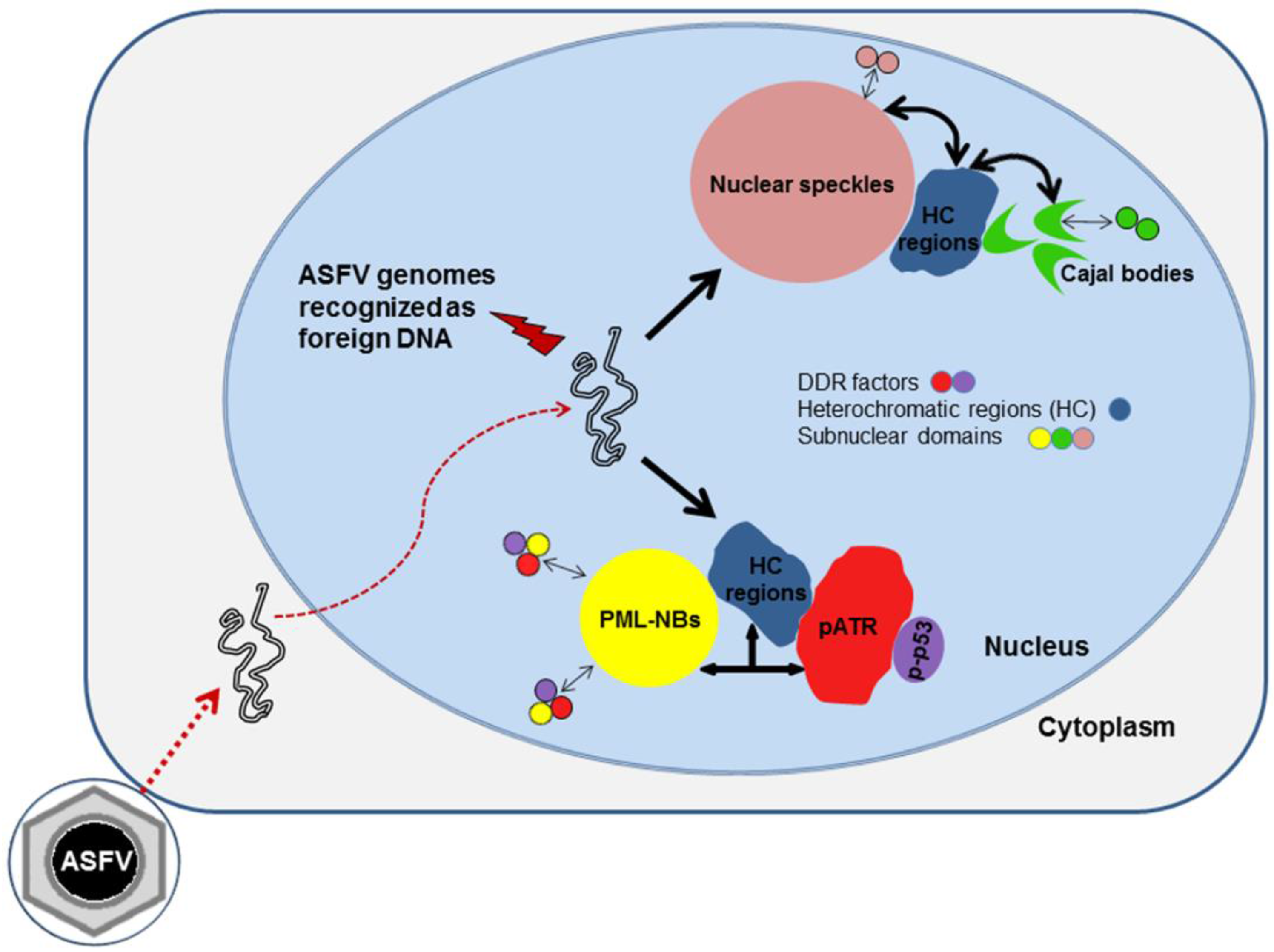 Proposed working model for ASFV-host interactions. ASFV-infected cells show a fully reorganized nuclear architecture. ASFV genomes most probably recognized as DNA damage sites, after migrating into host cell nucleus, activate DNA damage response factors (p-p53 and pATR), that juxtapose to enlarged PML-NBs (yellow circles). The activated p53 (p-p53, purple circles) and ATR (pATR, red shapes) also accumulate nearby heterochromatic regions (blue forms). In addition, the viral infection promotes nuclear speckles enlargement (pink circles) and Cajal bodies remodelling (green “comma-shaped” forms). All subnuclear domains display close vicinity to viral-induced heterochromatic regions enriched by H3K9me3, H3K27me3, HP1α/β isoforms and HDAC2.