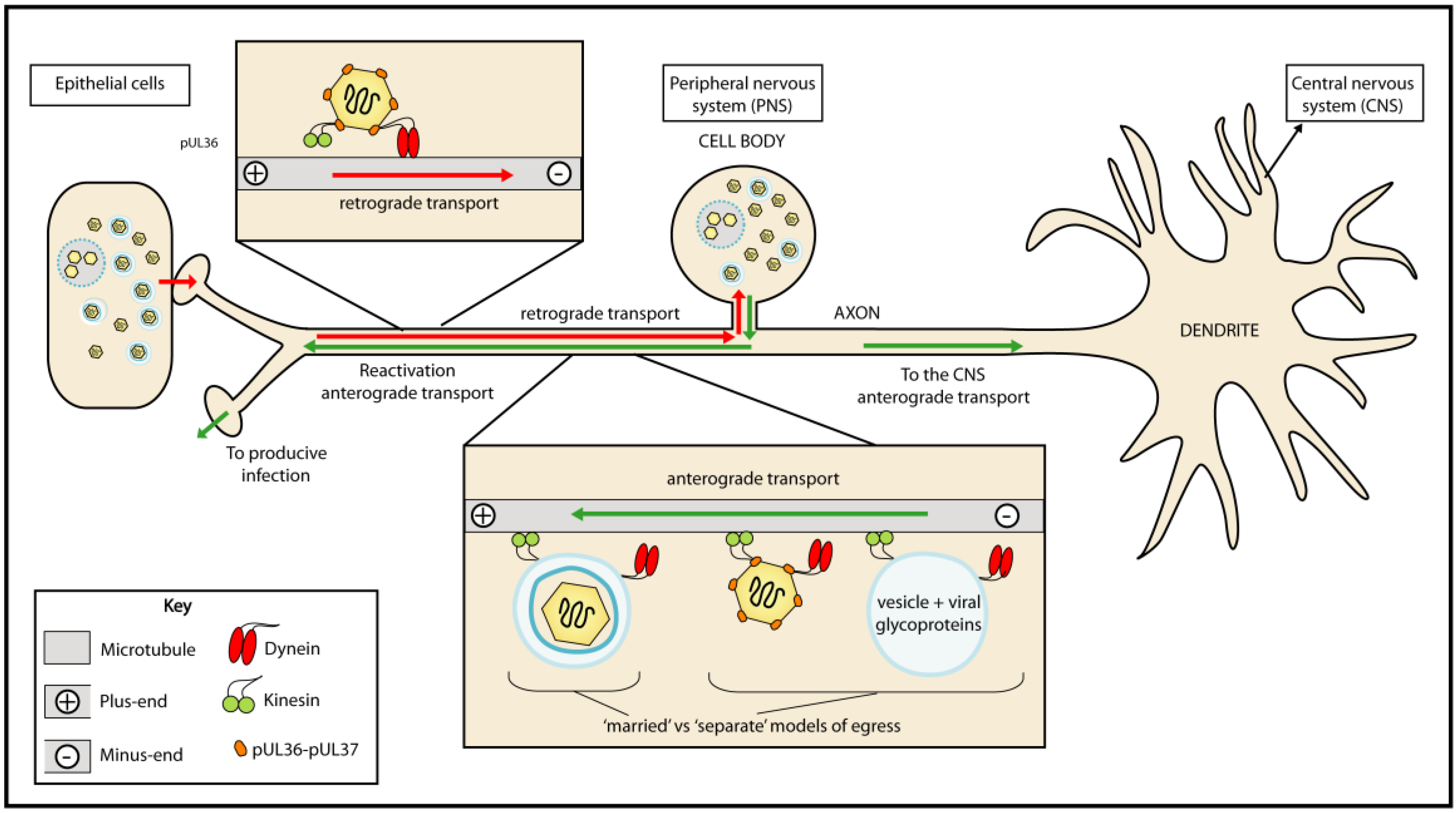 Neuronal trafficking during entry and egress. Alphaherpesviruses establish latent infection in the nuclei of peripheral ganglia following retrograde transport of capsids along microtubules. Reactivation results in the production of new virions that undergo anterograde trafficking back to peripheral tissues. The assembly state of viral particles prior to anterograde axonal transport is disputed and two models have been proposed: the “married model” predicts that virions are assembled in the cell body and trafficked within vesicles; the “separate model” predicts that capsids and secondary-envelopment membranes are trafficked separately with final virion assembly occurring at or near the sites of egress. Minus-end directed transport to the cell body along microtubules is driven by dynein while kinesins drive plus-end directed transport to the cell periphery. The movement of viral particles along axons during entry and egress is bidirectional and saltatory suggesting that both dynein and kinesin motor proteins may be involved. How the net direction of transport during entry and egress is determined is currently unknown.