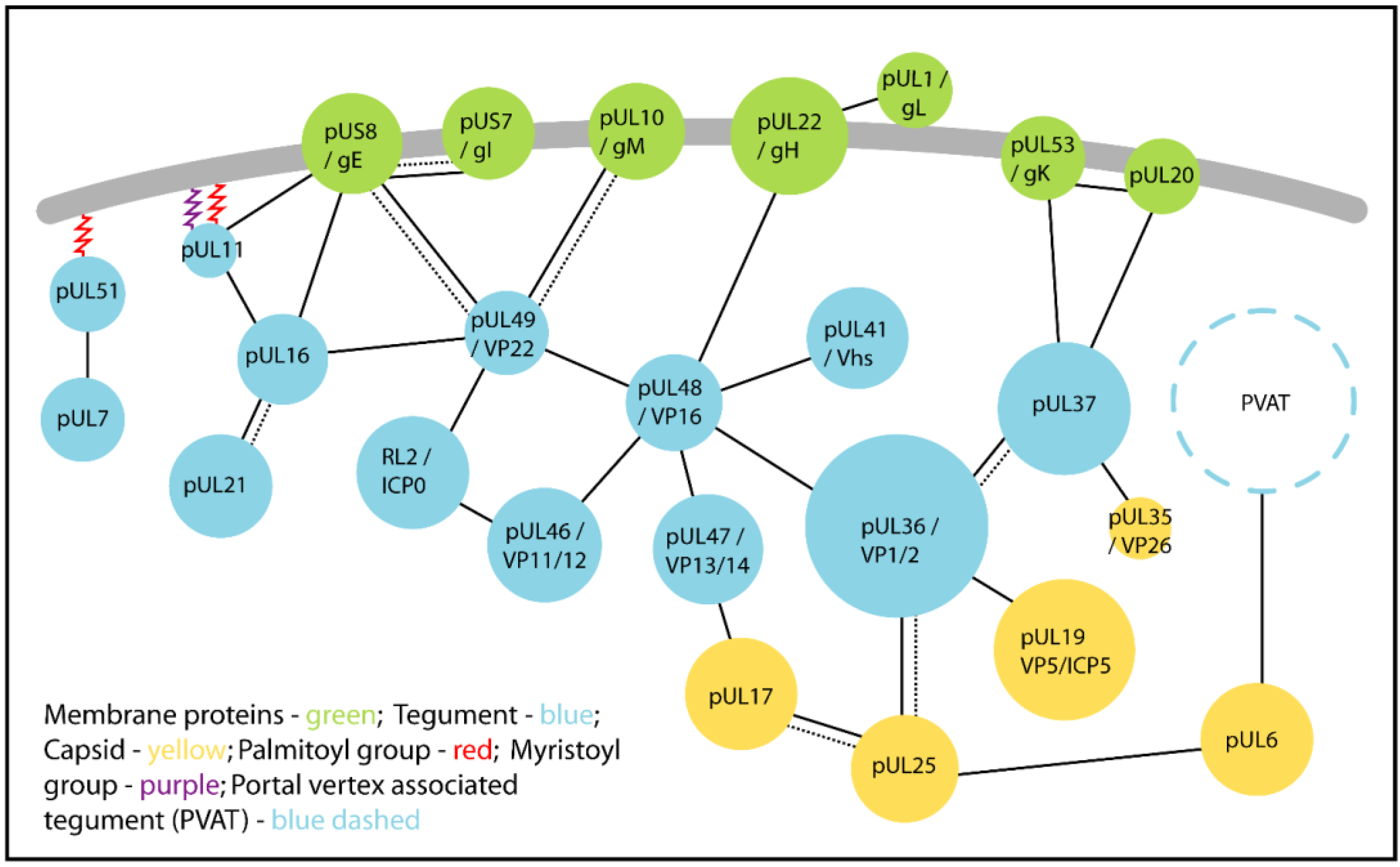 Conserved alphaherpesvirus tegument proteins (blue) link the capsid (yellow) to the glycoproteins and envelope proteins (green) embedded in the virion lipid bilayer envelope (grey). Tegument assembles via a dense network of protein:protein interactions: solid lines indicate interactions demonstrated in HSV and dashed lines show interactions demonstrated for PrV. Some tegument proteins associate directly with the envelope via post-translational modifications conferring lipophilic palmitoyl (red) or myristoyl (purple) groups. The proteins that comprise the portal vertex associated tegument (PVAT) are currently undefined.