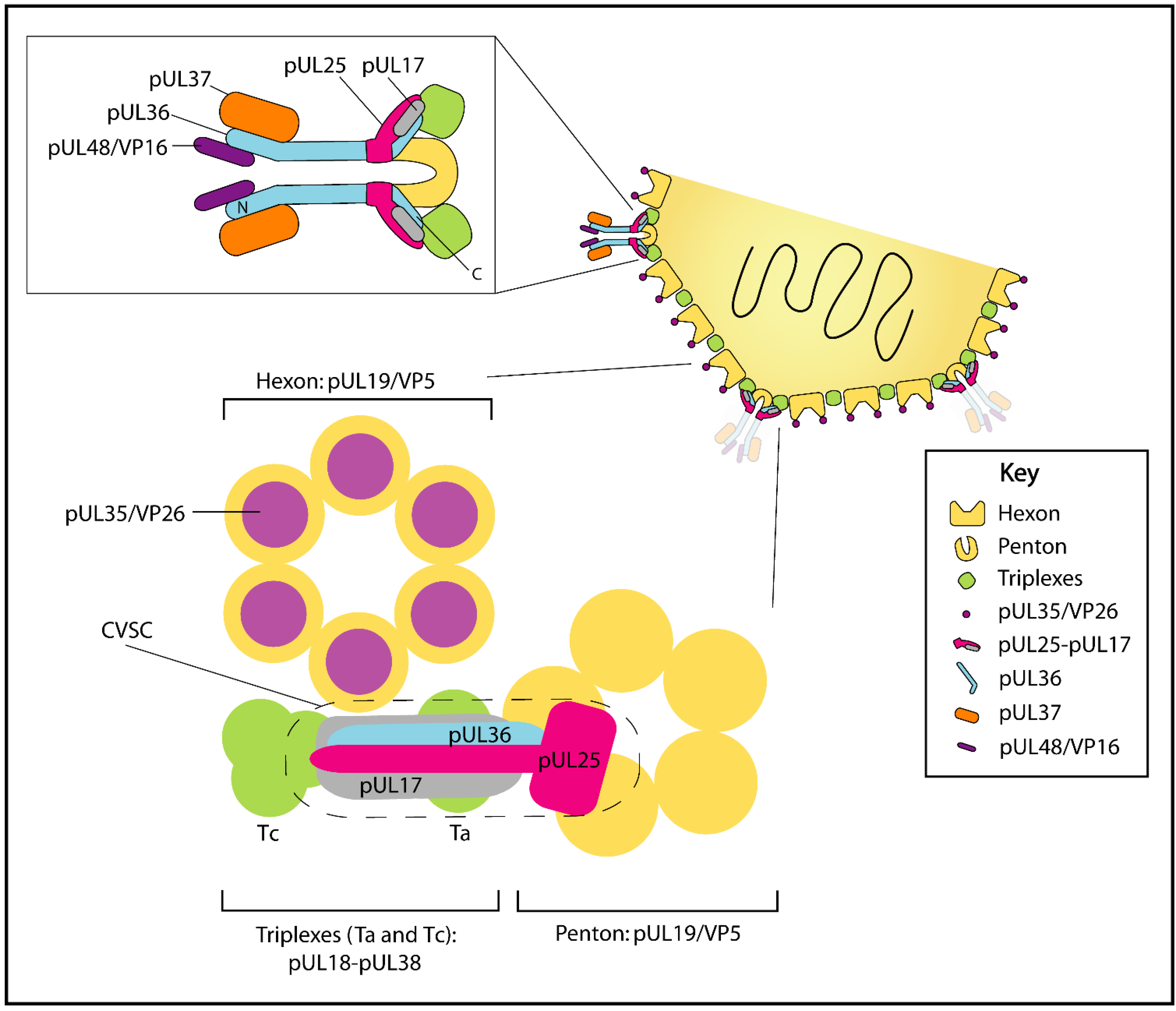 | pUL36 | VP1-2 | pUL19/VP5 [HSV-1] | Links the capsid and tegument, essential for tegumentation and secondary envelopment. | [24,25,105] |