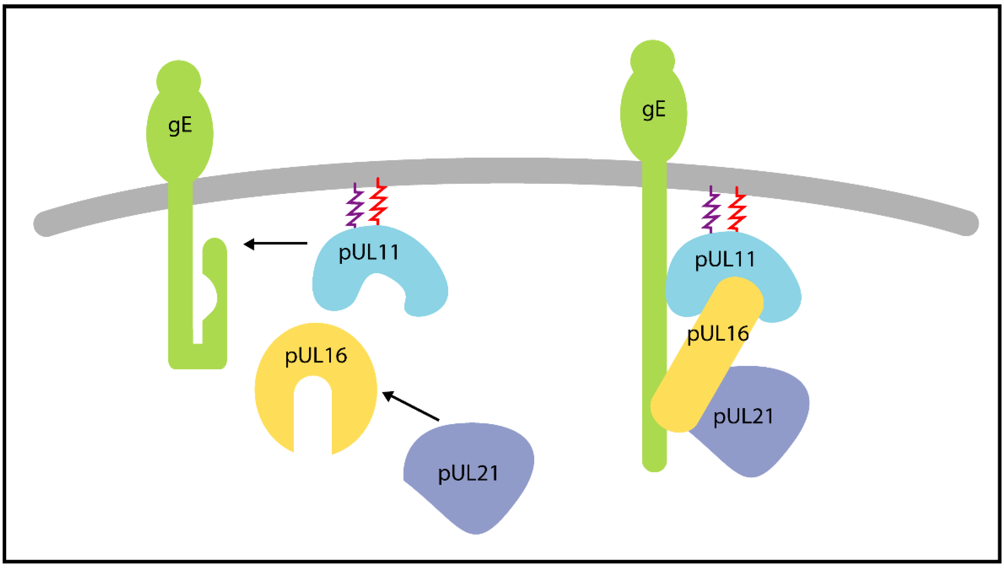 | pUL11 | - | pUL16 [HSV-1] | Role in secondary envelopment, also enhances interaction of pUL16 with gE. A tripartite complex of pUL11, pUL16 and pUL21 is proposed to play a role in cell fusion during syncytia formation, possibly through the interaction with gE. | [96,97,98] |