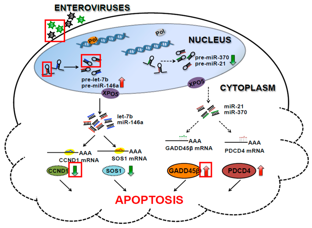 Cellular miRNAs are involved in Enterovirus infection-induced apoptosis. Hexagons indicate Enterovirus, hairpins indicate pre-miRNAs, red arrows indicate upregulated expression and green arrows indicate downregulated expression.