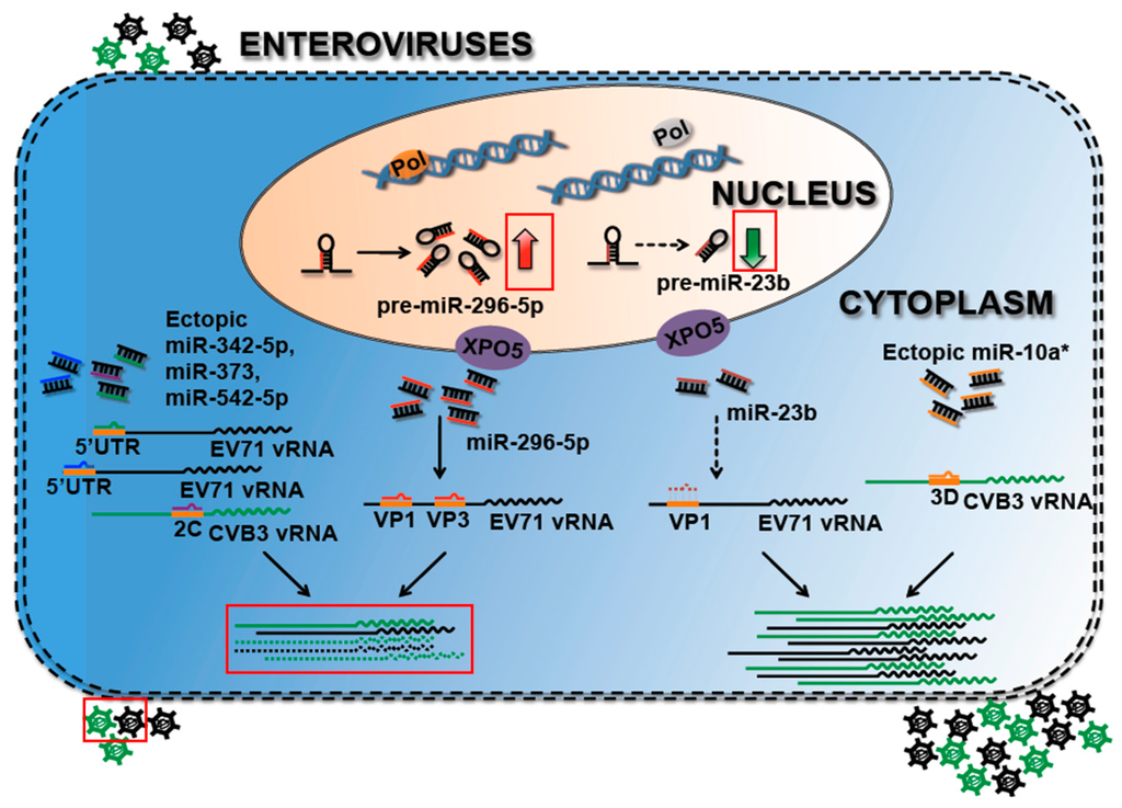 Cellular miRNAs play a regulatory role in the viral life cycle to suppress or promote virus replication by targeting the viral genome. MiR-296-5p is upregulated, while miR-23b is downregulated in EV71 infection. EV71 infection-induced miR-296-5p could target both viral VP1 and VP3 regions and result in the inhibition of virus replication. The downregulation of miR-23b in EV71 infection relieves EV71 viral RNAs (vRNAs) from miRNA-mediated inhibition. In addition to endogenous miRNAs, the ectopic introduction of miRNAs also affects virus replication. The ectopic expression of miR-342-5p, miR-373 or miR-542-5p suppresses Enterovirus replication, but miR-10* facilitates CVB3 replication. MiR-342-5p targets the CVB3 2C-coding region and thus inhibits CVB3 replication. In contrast, miR-10a* acts as a functional RNA molecule to facilitate CVB3 replication by targeting the viral 3D-coding region. Similarly, miR-373 and miR-542-5p attenuate EV71 propagation by targeting the 5′ UTR of EV71 vRNAs.