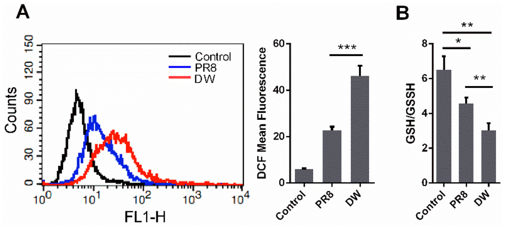 Highly pathogenic H5N1 influenza virus infection induced oxidative stress in A549 cells. (A) A549 cells were infected by H5N1 (DW), H1N1 (PR8), or control. 24 hpi, mean DCF fluorescence was determined via Flow cytometry as described in methods; (B) A549 cells were infected by DW, PR8, or control, 24 hpi, GSH/GSSH of whole cells was tested under manufacturer’s instruction. Data was mean ± SEM. Student’s t-test was used to analyze statistical significance. * p < 0.05, ** p < 0.01, *** p < 0.001.