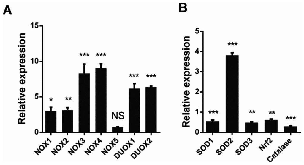 H5N1 infection promoted NADPH oxidases transcription, but downregulated key antioxidative genes transcription. A549 cells were infected by DW at 1 MOI, 24 hpi, total RNA was isolated for qRT-PCR. (A) NADPH oxidases transcription upon H5N1 infection. No-significant (NS) indicates p > 0.05; (B) some key antioxidative genes transcription upon H5N1 infection. GAPDH was used for normalization. Data was shown as relative expression to control infection and mean ± SEM of triplicate reactions. * p < 0.05, ** p < 0.01, *** p < 0.001.
