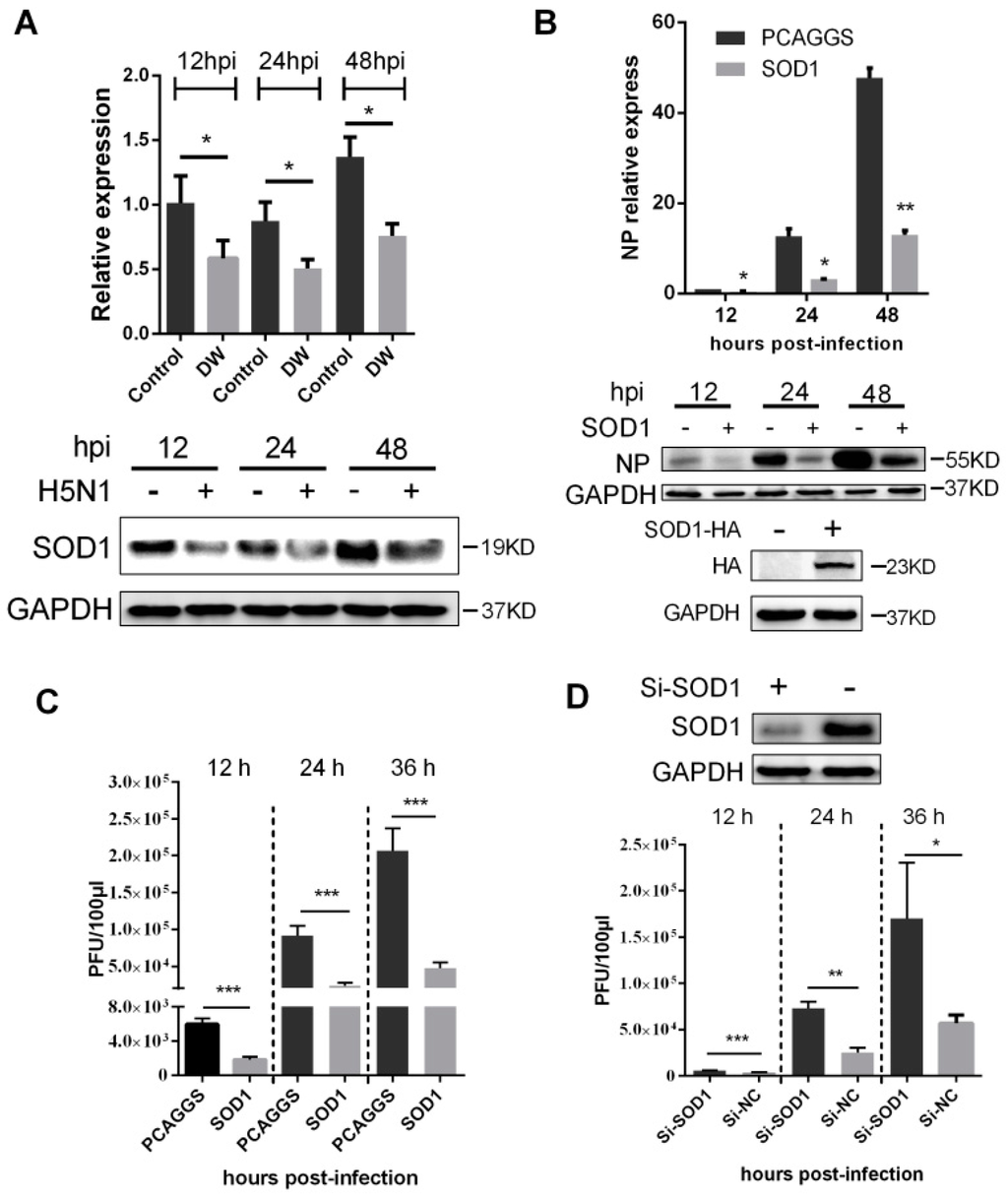 We demonstrated that H5N1 infection can down-regulate SOD1 expression. Forced SOD1 overexpression can disrupt H5N1 replication in A549 cells. This behavior may be attributed to the antioxidant role of SOD1; as a result, virus-induced apoptosis and pro-inflammatory response can be attenuated and H5N1 infection-induced mitochondrial dysfunction can be rescued to a certain extent.