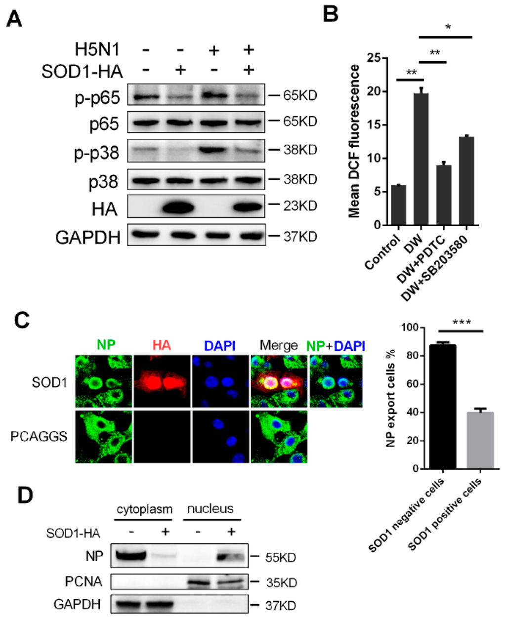 NF-κB pathway is sensitive to oxidants and is implicated in influenza virus replication and pro-inflammatory response. In this study, A549 cells were infected with 1 MOI H5N1 to evaluate whether SOD1 can modulate the NF-κB pathway. The results showed that the SOD1 overexpression could significantly reduce the H5N1-induced phosphorylation of p65 (Figure 5A). The SOD1 overexpression also inhibited the p38 kinase pathway, which initiates the pro-inflammatory response to H5N1 infection, as the phosphorylation of p38 was significantly reduced by the SOD1 overexpression (Figure 5A). What was interesting was that inhibition of NF-κB and p38 kinase by the corresponding inhibitors significantly reduced the H5N1-induced intracellular ROS production (Figure 5B). These results indicated that SOD1 might negatively regulate H5N1-activated NF-κB and p38 pathways by eliminating ROS, which in turn impeded the activation of NF-κB and p38 pathways. Considering that the p38 kinase pathway is closely related to the nuclear export of virus ribonucleoprotein (RNP) complexes [,], we investigated the effect of the SOD1 overexpression on the retention of RNP complexes. A549 cells were overexpressed with SOD1 and infected with 5 MOI H5N1. The cells were analyzed in terms of RNP export at 6 hpi. The immunofluorescence staining results revealed that the nuclear export of the RNP complexes was inhibited in the SOD1-overexpressed cells (Figure 5C). Cytoplasm and nucleus separation assay also suggested its inhibition on NP export (Figure 5D).