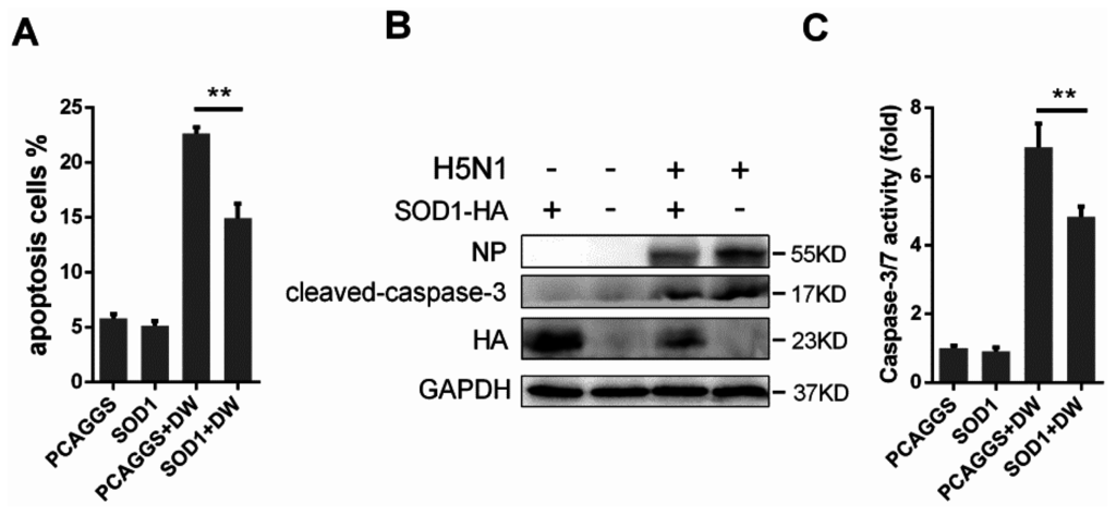 Oxidative stress is likely involved in virus-induced apoptosis [,]; as such, we investigated whether the ROS reduction by SOD1 overexpression can rescue H5N1-induced apoptosis. The control cells or the SOD1-overexpressed A549 cells were infected with DW at 1 MOI. The cells were collected, and the apoptosis rate was analyzed through flow cytometry. Figure 6A indicates that the SOD1 overexpression significantly reduced virus-induced apoptosis. Compared with that in the control cells, the SOD1 overexpression also decreased the cleavage of caspase-3 substrate (Figure 6B) and attenuated the activation of caspase-3/7 caused by H5N1 infection (Figure 6C). The apoptosis inhibition was also observed when the assay was performed in mouse primary lung epithelial cells (Figure S7). Additionally, the apoptosis was significantly decreased in DPI-treated cells (Figure S8). These results strongly suggested that the SOD1 overexpression can protect virus-infected A549 cells against apoptosis, and this may be related to alleviation of oxidative stress.